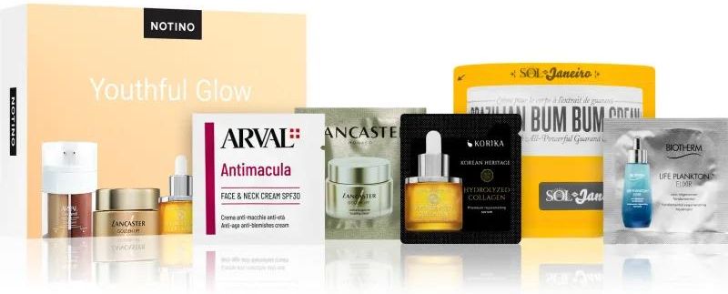 Beauty Discovery Box Notino Youthful Glow, , Zestawy kosmetyków dla kobiet, Wszystko dla ładnie wyglądającej skóry w jednym opakowaniu. Zestaw kosmetyków Beauty Discovery Box Notino Youthful Glow zawiera nie jeden, ale kilka produktów, które pomogą ułożyć lub wzbogacić codzienną rutynę kosmetyczną sprawiając radość Tobie lub Twoim bliskim. Zawartość zestawu: Sol de Janeiro Brazilian Bum Bum Cream ujędrniający krem wygładzający na pośladki i biodra 7,5 ml Arval Couperoll Double Serum serum dwufazowe na dzień i na noc 2+2 ml KORIKA Korean Heritage Hydrolyzed Collagen Premium Rejuvenating Serum odmładzające serum do twarzy z hydrolizowanym kolagenem 2 ml Biotherm Life Plankton Elixir ochronne serum regenerujące 1 ml Lancaster Golden Lift przeciwzmarszczkowy krem na dzień 1,5 ml Właściwości: zestaw produktów kosmetycznych do codziennego stosowania dla uzyskania efektu pięknie wygładzonej i nawilżonej skóry zawiera mini-wersje produktów