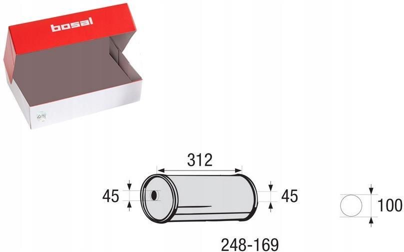 Tłumik układu wydechowego (uniwersalny, okrągły, wys.:45mm, śr. zew.: 100mm, szer.: 45mm, dł.: 312mm, średnica wlotu: 45mm, średnica wylotu: 45mm). Średnica [mm]: 100 Średnica wewnętrzna 1 [mm]: 45 Średnica wewnętrzna 2 [mm]: 45 Długość [mm]: 312 Szerokość [mm]: 100 Wysokość [mm]: 100 Rodzaj …