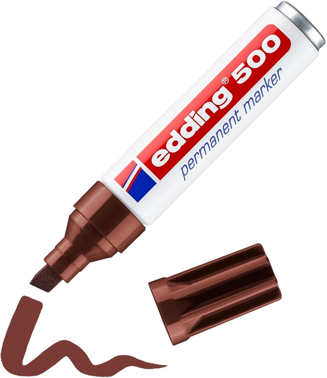 MARKER PERMANENTNY E-500 EDDING, BRĄZOWY Kompaktowy i poręczny marker edding do znakowania większości materiałów, np. papieru, kartonu, metalu, szkła, plastiku i drewna. Ścięta końcówka o szerokości pisania 2-7 mm. Trwała obudowa sprawia, że doskonale pasuje do skrzynki narzędziowej. Wodoodporny i odporny na ścieranie na niemal każdej powierzchni. Tusz jest odporny na działanie oleju, daje się zmywać za pomocą alkoholu i acetonu. Produkt do wielokrotnego napełniania tuszami uzupełniającymi edding T 25, T100 i T 1000. Zapasowe końcówki (wymienne końcówki do edding 500). Bezwonny tusz bez dodatku toulenu/ksylenu.