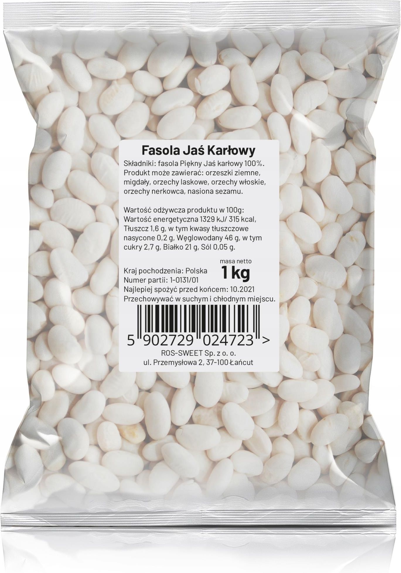 MORESO FASOLA BIAŁA PIĘKNY JAŚ KARŁOWY 1 KG Fasola Jaś Karłowy - zdrowie i smak na talerzu! Fasola Jaś Karłowy to mała, biała fasola o delikatnym smaku. Jest bogata w białko, błonnik, witaminy i minerały, co czyni ją idealnym produktem dla osób dbających o zdrowie. Fasola Jaś - bogactwo natury: Silne właściwości alkalizujące: Fasola Jaś neutralizuje nadmiar kwasów w organizmie, co przyczynia się do utrzymania równowagi kwasowo-zasadowej. Niski poziom tłuszczu: W porównaniu do innych gatunków fasoli, Fasola Jaś zawiera mniej tłuszczów, co czyni ją idealnym produktem dla osób dbających o zdrową sylwetkę. Źródło cennych minerałów: Fasola Jaś jest bogata w fosfor, magnez, żelazo, wapń, cynk, a także witaminy A, B i PP. Składniki te wspomagają pracę wielu układów w naszym organizmie. Korzystne działanie na wątrobę i płuca: Fasola Jaś wspomaga oczyszczanie wątroby i działa detoksykująco na płuca. Upiększające działanie na skórę: Zawarte w Fasoli Jaś witaminy i minerały pozytywnie wpływają na stan skóry, czyniąc ją bardziej promienną i zdrową. Składniki: fasola Jaś karłowy 100 %. Informacje o alergenach: W zakładzie konfekcjonowane są produkty zawierające: orzeszki ziemne, migdały, orzechy laskowe, orzechy włoskie, orzechy nerkowca, nasiona sezamu. Możliwość wystąpienia alergenów w produktach nie zawierających w składzie składników alergennych jest minimalizowana, jednak nie możemy w 100% zagwarantować, że w pakowanych produktach nie znajdą się niewielkie ilości alergenów. Przechowywanie: Przechowywać w suchym i chłodnym miejscu niedostępnym dla małych dzieci. Wartość energetyczna W 100 g 1329 kJ / 315 kcal, Tłuszcz 1,6 g, w tym kwasy tłuszczowe nasycone 0,2 g, Węglowodany 46 g, w tym cukry 2,7 g, Błonnik 16 g, Białko 21 g, Sól 0,05 g