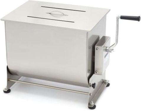 Mieszarka Do Mięsa Kiełbasy Farszu 50L Mikser do mięsa z pokrywą MAXIMA NL Marka Model: MAXIMA Nr katalogowy: 9368014 Certyfikat CE / Atest: Tak Dane techniczne Numer artykułu: 09368014 Kod kreskowy (EAN): 8720365344374 Szerokość (cm): 53 Głębokość (cm): 32.5 Wysokość (cm): 45.5 Typ zasilacza: Brak zasilania Obudowa, ostrza miksujące i pokrywa z nierdzewnej stali szlachetnej Funkcja przechylania z możliwością zablokowania pozycji Trwały i wygodny uchwyt obrotowy Dane techniczne Łatwo zdejmowane skrzydełko i dźwignia miksująca Mikser może obracać się w dwóch kierunkach Wyposażony w łożyska kulkowe z uszczelką Gumowe nóżki chroniące blat Idealny do mieszania mięsa i przypraw Łatwy do czyszczenia dzięki uchylnej misie Waga netto: 16 kg Wymiary: W53 x D32,5 x H45,5cm Pojemność: 35-43kg (w zależności od struktury mięsa) Pojemność: maksymalnie 50L Dzięki temu przechylnemu mikserowi do mięsa można błyskawicznie wymieszać mięso lub rybę z przyprawami lub innymi składnikami. To poręczne urządzenie jest podstawą wielu różnych nadzień, hamburgerów, kiełbasek lub dań rybnych, a dodatkowo oszczędza Ci brudzenia rąk. Uchylna misa i wygodny uchwyt obrotowy Mieszanie mięsa w tym mikserze do mięsa ze stali nierdzewnej jest bardzo proste: wystarczy otworzyć pokrywę i napełnić zbiornik pożądaną ilością mięsa lub ryby. Zbiornik ma pojemność 50 litrów i nadaje się do przetwarzania 35-43 kg mięsa lub ryby. Po dodaniu głównego składnika możesz dodać przyprawy, takie jak zioła, orzechy lub warzywa. Aby wszystko dobrze wymieszać, obracaj uchwytem, aż uzyskasz odpowiednią konsystencję mięsa lub nadzienia. Mikser do mięsa może obracać się w dwóch kierunkach. Uchylny zbiornik jest bardzo poręczny, gdy chcesz wyjąć zawartość, a także stanowi dużą zaletę podczas czyszczenia. Aby zapewnić dobrą przyczepność na niemal każdej powierzchni, mikser do mięsa jest wyposażony w cztery gumowe nóżki. Obudowa, skrzydełka miksujące i pokrywa wykonane są ze stali nierdzewnej i są bardzo łatwe do czyszczenia. Ułatw sobie to jeszcze bardziej i umieść je w zmywarce. Ważne jest, aby dokładnie wyczyścić mikser do mięsa po każdym użyciu. Pracujesz ze świeżymi produktami, a mięso i ryby są podatne na bakterie. Wyjmij części z urządzenia, aby wyczyścić zbiornik. Usuń duże resztki jedzenia za pomocą suchej ściereczki. Następnie użyj wilgotnej ściereczki, ciepłej wody i odrobiny łagodnego detergentu, aby dokładnie wyczyścić zbiornik. Po czyszczeniu dobrze osusz wszystko miękką ściereczką i ponownie złóż mikser do mięsa. Zakres dostawy urządzenie instrukcja obsługi opakowanie Produkt ten idealnie również nadaje się na prezent. Pozostałe zdjęcia poniżej: