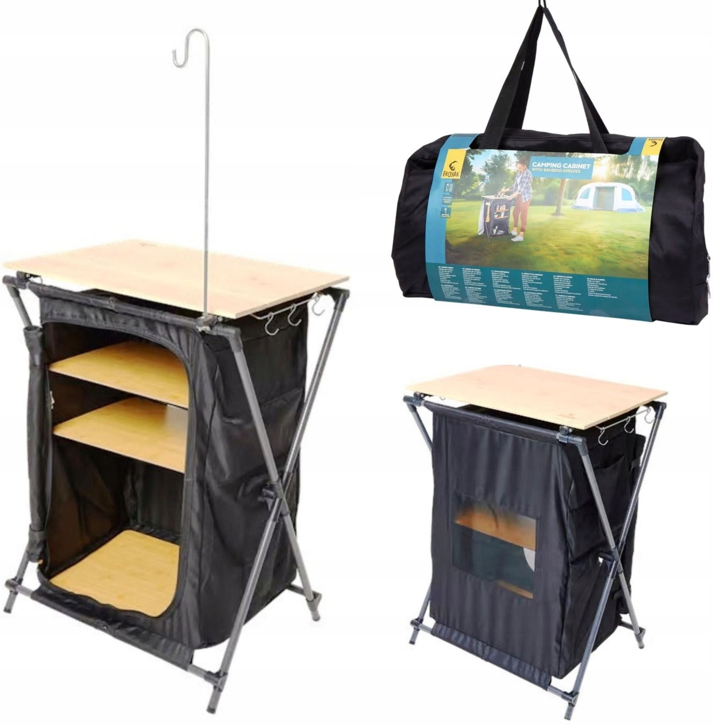 Składana szafka kempingowa z bambusowym blatem praktyczne kompaktowe wymiary: 80 x 60x 46 łatwa do przewozu, spakowana w torbę przewozową blat z elastycznie połączonych deseczek bambusowych 3 półki w deseniu bambusowym Szafka szybko rozkładana, pomieścisz w niej podręczny sprzęt kuchenny potrzebny …