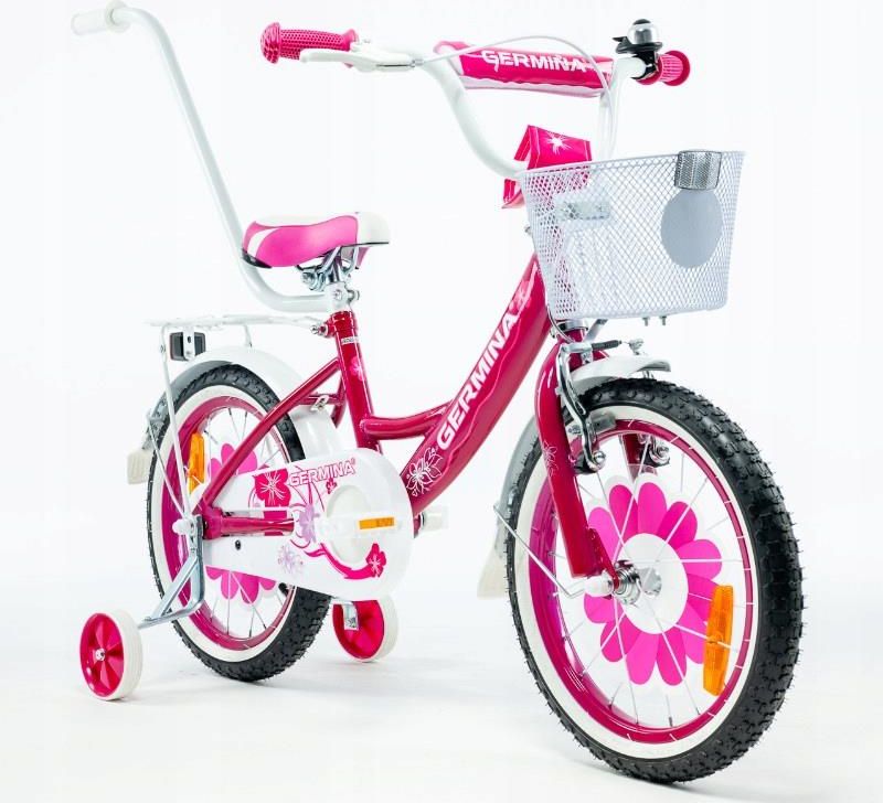 Germina Różowy Rowerek Dziecięcy 16" Dla Dziewczynki Koszyk Kółka Boczne Prowadnik Miechów