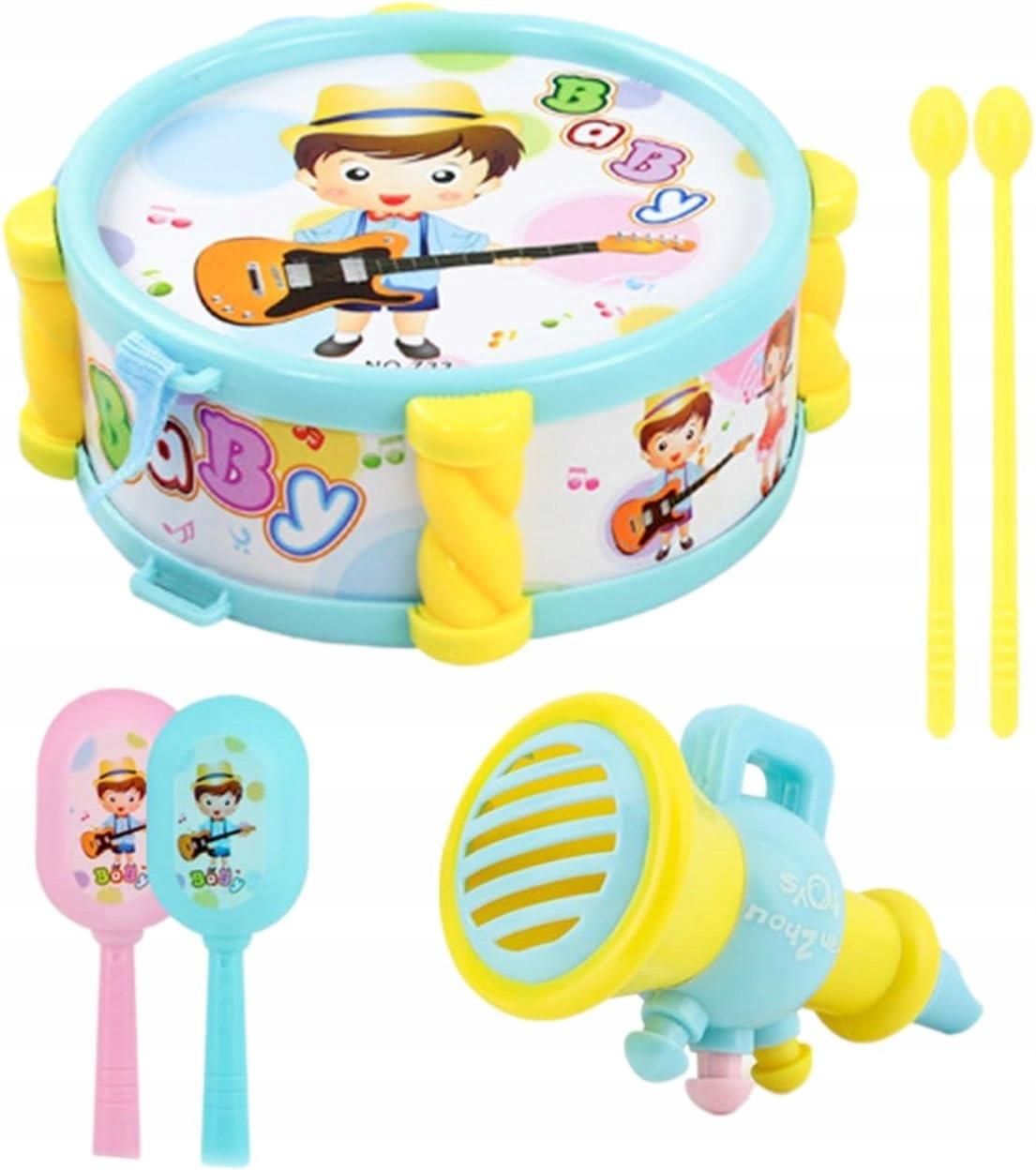 INSTRUMENTY MUZYCZNE SENSORYCZNE MALUCHA BĘBENEK + GRZECHOTKI KOLORY SUPER ZESTAW MUZYCZNY DLA KAŻDEGO DZIECKA Zabawa instrumentami pobudza kreatywność malucha i cieszy każdego dnia ! Pomaga rozwijać słuch i skupiać uwagę. W zestawie bębenek bez pasków dwie pałeczki grzechotka trąbka grzechotki …