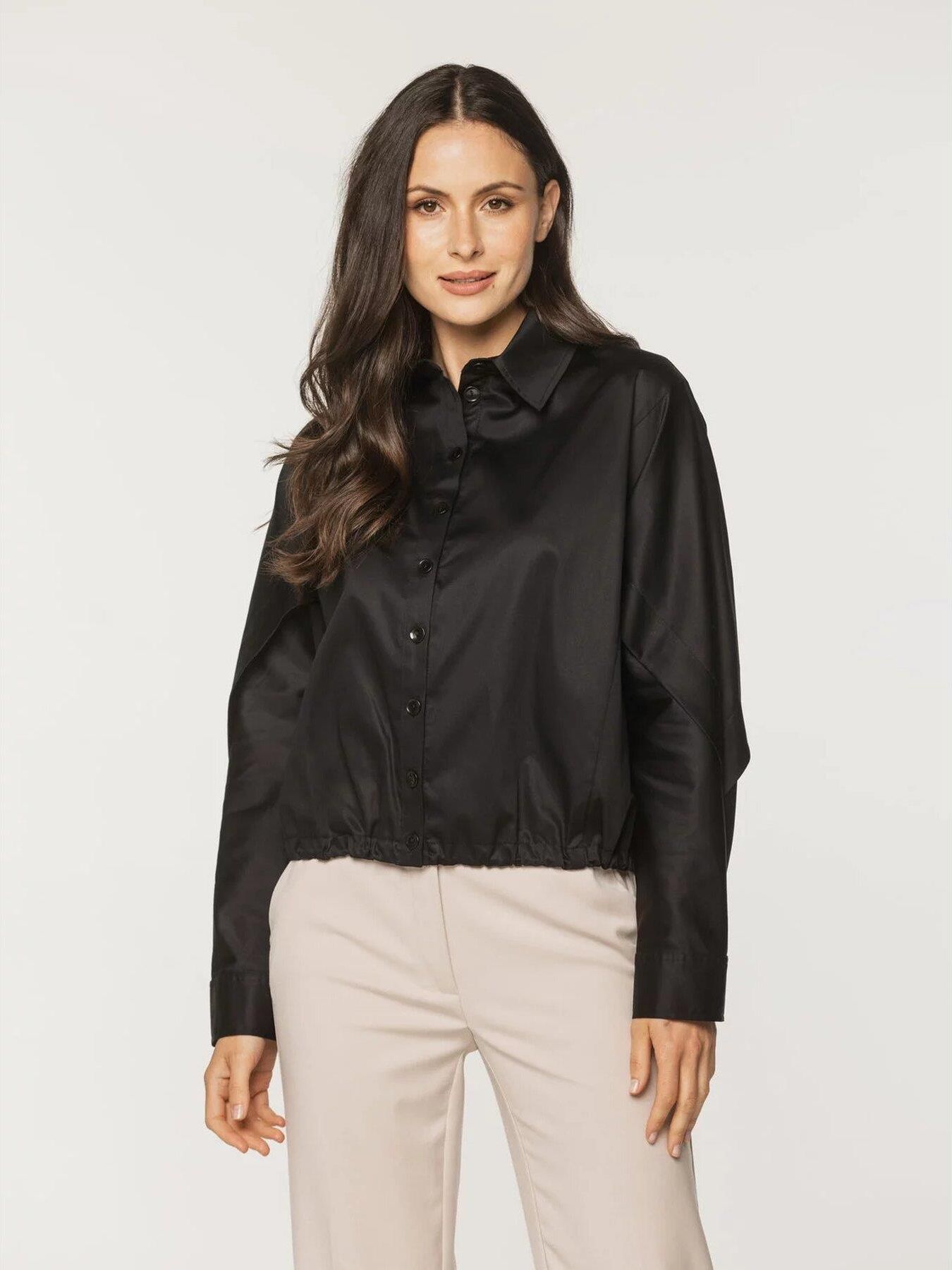 Czarna, krótka koszula damska o luźnym kroju i gładkiej fakturze z klasycznym kołnierzykiem i gumką