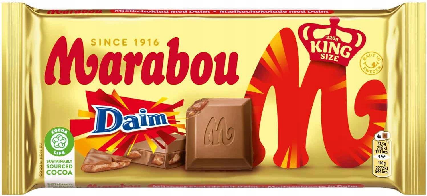 MARABOU CZEKOLADA MLECZNA Z KARMELKAMI DAIM KING SIZE 220g Słodycze stanowią niezwykle ważny element w życiu każdego człowieka. Kochają je nie tylko dzieci, pomimo tego że produkowane są zwykle z myślą o nich. Chyba każdy – niezależnie od wieku – ma ochotę od czas do czas na „małe co nieco”. Pozwól sobie zatem na chwilę przyjemności i wybierz coś pysznego spośród setek naszych słodkich produktów. Marabou Daim King Size to idealny wybór dla każdego, kto ceni sobie wysokiej jakości czekoladę z dodatkowym bogactwem smaku dzięki wplecionym kawałkom karmelu Daim. To zarówno doskonała przekąska, jak i inspiracja do tworzenia unikalnych deserów. Pojemność i opakowanie: Opakowanie zawiera 220 gramów czekolady Marabou Daim w formacie King Size. Czekolada jest zapakowana w charakterystyczne, łatwo rozpoznawalne opakowanie, które chroni jej świeżość i jakość. Unikalne połączenie smaków: Marabou Daim King Size to połączenie klasycznej, aksamitnej mlecznej czekolady Marabou z chrupiącymi kawałkami karmelu Daim. To połączenie sprawia, że każda kostka czekolady oferuje bogate doświadczenie smakowe, które zadowoli zarówno miłośników czekolady, jak i karmelu. Idealna do dzielenia się: Duży rozmiar czekolady jest idealny do dzielenia się z rodziną i przyjaciółmi. Może być świetnym dodatkiem do kawy lub herbaty, jak również wyjątkowym przysmakiem podczas wspólnego oglądania filmów czy spotkań. Szwedzka jakość: Marabou jest jedną z najbardziej cenionych marek czekolady w Szwecji, znanej z wysokiej jakości produktów. Czekolada Marabou Daim King Size jest produkowana z najlepszych składników, co gwarantuje jej doskonały smak i jakość. Uniwersalność zastosowań: Oprócz bycia doskonałą przekąską, czekolada Marabou Daim może być również używana jako składnik deserów, takich jak ciasta, babeczki czy lodowe pokusy. Chrząstka karmelu dodaje ciekawego akcentu do różnorodnych słodkości. Zachęta do eksperymentowania: Unikalne połączenie mlecznej czekolady i chrupiącego karmelu inspiruje do tworzenia nowych przepisów i eksperymentowania w kuchni, co może być świetną zabawą dla całej rodziny. MarketNiemiecki to zaufany importer niemieckich produktów. Gwarantujemy legalność pochodzenia oferowanego towaru.