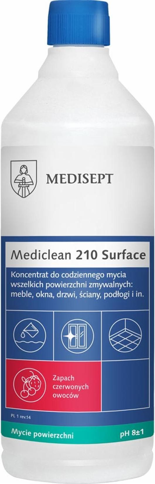 MED-210SURFACE Koncentrat do czyszczenia powierzchni, mediclean 210 surface. przeznaczony do mycia ręcznego. Nie zostawia smug, nadaje właściwości antystatyczne i delikatny połysk. Nadaje delikatny połysk i przyjemny zapach oraz właściwości antystatyczne. Może być stosowany w zakładach przetwórstwa spożywczego, również na powierzchniach mających kontakt z żywnością. Polecany do mycia powierzchni wykonanych z tworzyw sztucznych, powierzchni lakierowanych, płytek ceramicznych, marmuru, szkła, mebli, okien, drzwi i in. Uniwersalny - sprawdzi się do mycia wszystkich powierzchni wodoodpornych. Zalecane stężenie: 25 - 200 ml na 10 l zimnej wody. Dostępne rodzaje: C - czerwone owoce. Pojemność: 1 l, 5 l. Marka: MEDISEPT