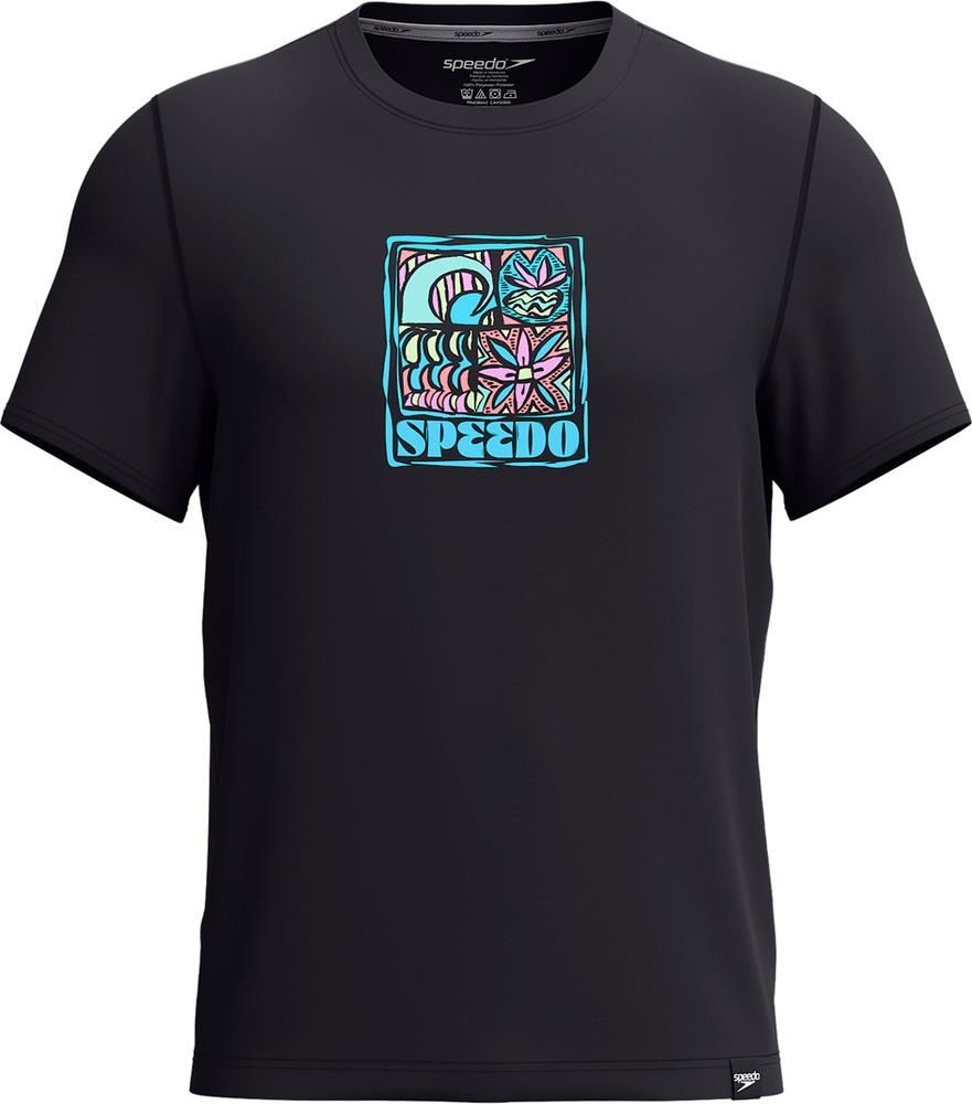 Czarna koszulka pływacka z krótkim rękawem i grafiką w stylu retro. Wygodny krój z okrągłym dekoltem oraz materiał z ochroną upf50+ zapewniają ochronę przed słońcem, zarówno na desce, jak i na plaży. Szybko schnie dzięki materiałowi turbodri. • ochrona przed promieniowaniem uv• turbodri: szybkoschnący materiał• okrągły dekolt• krótkie rękawy• regularny krój Skład materiału: 100% poliester z recyklingu