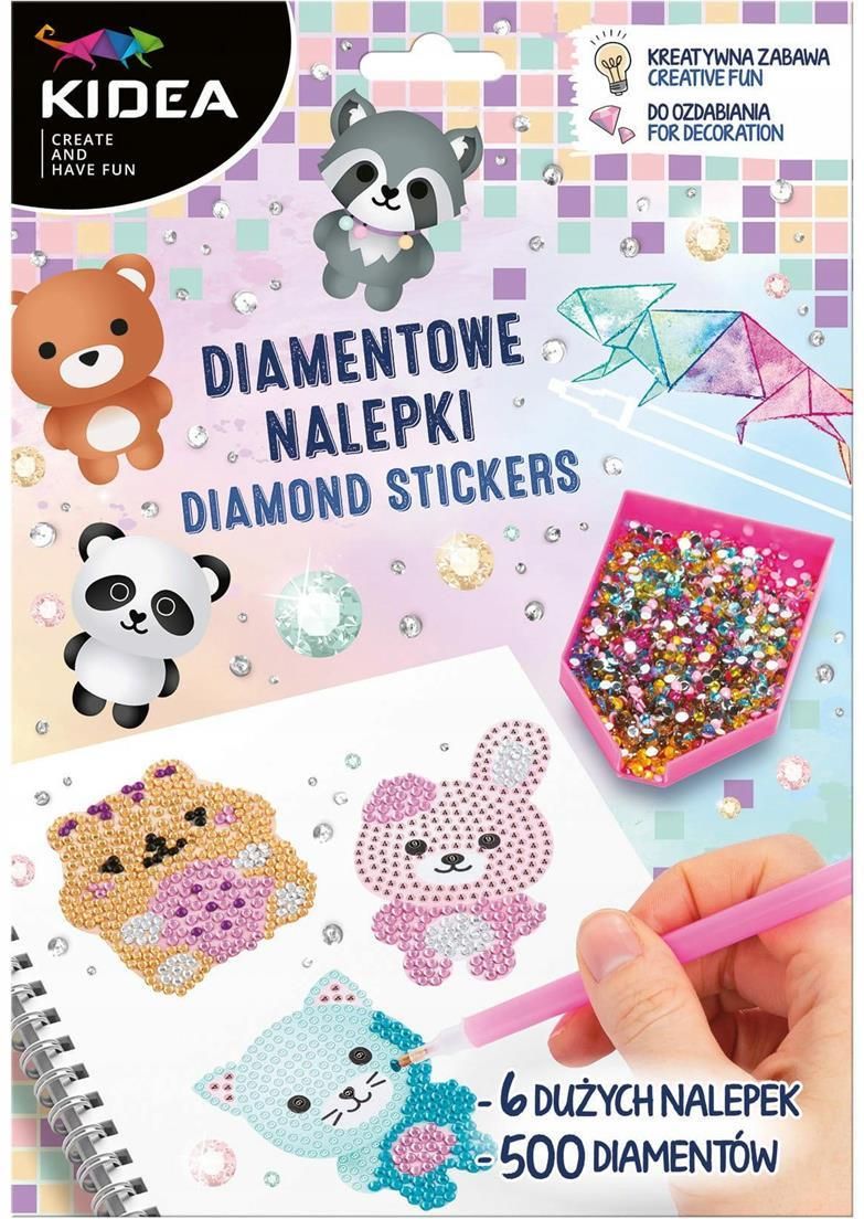 Naklejki diamentowe Wesołe Zwierzęta Kidea DERFORM ✅ ✔️ Kreatywny zestaw do dekoracji od Kidea. W skład wchodzi 6 urokliwych nalepek z wizerunkiem kotka, pandy, chomika, króliczka, szopa i misia. Do ozdbienia służy 500 błyszczących kryształków w 9 odcieniach, wraz z niezbędnymi akcesoriami: …