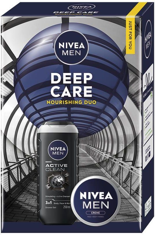 NIVEA MEN Deep Care, , Zestawy kosmetyków dla mężczyzn, Wszystko dla pięknej skóry w jednym opakowaniu. Zestaw kosmetyków NIVEA MEN Deep Care sprawi radość Tobie lub jako prezent zachwyci Twoich bliskich. Zawartość zestawu: NIVEA MEN Active Clean żel pod prysznic dla mężczyzn 250 ml NIVEA MEN Original krem dla mężczyzn 75 ml Właściwości: zestaw produktów kosmetycznych do codziennego stosowania do kompleksowej pielęgnacji skóry zestaw prezentowy doskonały pomysł na prezent sprawi radość każdemu mężczyźnie Sposób użycia: Stosuj każdy z produktów z zestawu zgodnie z załączoną do niego instrukcją.
