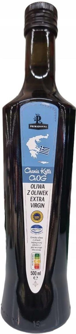 Oliwa z Oliwek Extra Virgin 500 ml Primadonna Dzięki zastosowaniu zaawansowanych technologii tłoczenia i Oliwa wyróżnia się najwyższą jakością. Oliwa z oliwek z pierwszego tłoczenia Chamia Kritis ChOG*. Najwyższa kategoria oliwy z oliwek. Oliwa z oliwek uzyskana bezpośrednio z oliwek i wyłącznie za pomocą środków mechanicznych. Oliwa Grecka. * Chronione Oznaczenie Geograficzne Pojemność: 500 ml