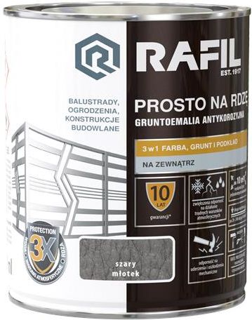 RAFIL Prosto na Rdzę Młotek Pojemność: 0,75L | Kolor: szary ZASTOSOWANIE Metal Barierki i balustrady Wyroby kowalstwa artystycznego Bramy i ogrodzenia Elementy ozdobne DOSTĘPNE KOLORY RAFIL PROSTO NA RDZĘ MŁOTEK szary srebrny szary brązowy czarny OPIS PRODUKTU RAFIL Prosto na Rdzę, do …