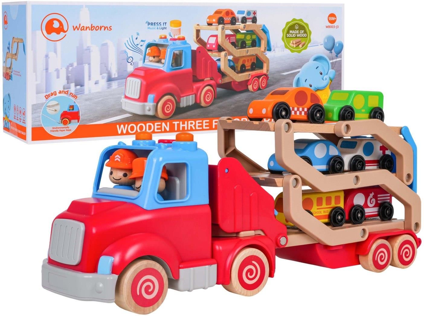 Opis Drewniana Laweta + Autka Drewniana, interaktywna laweta z pojazdami w zestawie dla dzieci od osiemnastego miesiąca życia. Zabawka wykonana została z najlepszej jakości materiałów: plastiku i drewna. Żywe kolory przyciągają uwagę dziecka i zachęcają do zabawy. Lawetę można odpiąć od pojazdu lub rozłożyć i stworzyć tor dla autek. W zestawie znajduje się 6 drewnianych pojazdów: policja, taksówka, wóz strażacki, karetka, autobus, samochód dostawczy. Na dachu pojazdu jest przycisk odpowiedzialny za generowanie odgłosów odpalania ciężarówki, trąbienia czy odtwarzania melodii. Efektom dźwiękowym towarzyszy mruganie światełek. Z przodu ciężarówki znajduje się zaczep na ewentualny sznureczek do ciągnięcia zabawki. Zabawka zasilana jest bateriami typu 3 x AG13 (baterie w zestawie). Funkcje: zabawka odpowiednia dla dzieci od osiemnastego miesiąca życia, wykonana z drewna i plastiku, nie posiada ostrych zakończeń, 6 pojazdów i 2 figurki postaci w zestawie, efekty dźwiękowe: odpalania ciężarówki, trąbienie, odtwarzanie melodii, efekty świetlne, mrugające dwa światełka na dachu ciężarówki. Wymiary pojazd z lawetą złożoną ok. 38 cm x 15 cm x 11 cm, pojazd z lawetą rozłożoną ok. 79 cm x 13,5 cm x 11 cm, pojazdy ok. 7 cm x 4 cm x 4 cm, figurki postaci ok. 6,5 cm x 3 cm, opakowanie ok. 39,5 cm x 15,2 cm x 11,5 cm. Zawartość zestawu laweta, 6 pojazdów: policja, taksówka, wóz strażacki, karetka, autobus, samochód dostawczy, 2 x drewniana figurka postaci.