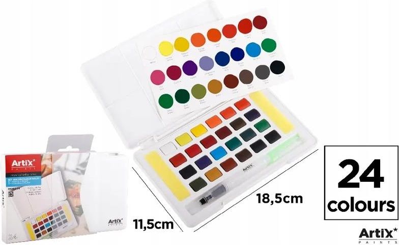 Farby Akwarelowe ARTIX z Wodnym Pędzlem Oferujemy zestaw farb akwarelowych ARTIX, który zawiera 24 intensywne kolory. Każdy kolor jest zamknięty w poręcznym opakowaniu, które sprawia, że malowanie staje się przyjemnością. Do zestawu dołączony jest specjalny pędzel wodny, dzięki któremu łatwo uzyskasz płynne przejścia i delikatne efekty akwarelowe. Idealne dla Każdego Artysty Ten komplet doskonale sprawdzi się zarówno dla początkujących, jak i zaawansowanych artystów. Łatwa aplikacja i wyraziste barwy czynią z tego zestawu wspaniałe narzędzie do wyrażania artystycznych wizji. Wykorzystaj farby ARTIX, aby tworzyć niesamowite dzieła i czerpać radość z malowania. EAN: 8435250914548