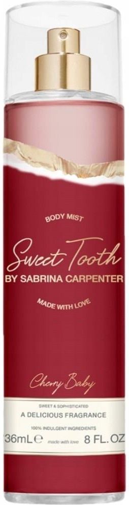 SABRINA CARPENTER Sweet Tooth – Mgiełka do ciała dla kobiet, 236 ml SABRINA CARPENTER Sweet Tooth – Mgiełka do ciała dla kobiet, 236 ml Pozwól sobie na odrobinę słodkiej przyjemności z mgiełką zapachową Sweet Tooth ten wyjątkowy zapach otuli Cię zmysłowym połączeniem ciepłych i słodkich nut, zapewniając świeżość oraz długotrwały zapach na co dzień. Co wyróżnia mgiełkę Sweet Tooth? Zapach powstał z inspiracji kultową wodą perfumowaną SABRINA CARPENTER Sweet Tooth o następującej kompozycji zapachowej: Nuty głowy: Musująca bergamotka, kandyzowany imbir, pianka czekoladowa – energetyczny i słodki początek. Nuty serca: Płatki jaśminu, mleczko kokosowe, wanilia z Madagaskaru – kremowe i egzotyczne nuty, które dodają elegancji i kobiecości. Nuty bazy: Drzewo kaszmirowe, śmietanka z Chantilly, cukrowe piżmo – ciepłe i zmysłowe wykończenie, pozostawiające delikatny, jedwabisty akcent. Mgiełka to połączenie kwiatowych i owocowych nut, które zachwycą każdą kobietę kochającą słodkie i zmysłowe kompozycje. Idealna na co dzień – lekka i praktyczna formuła, która nie obciąża skóry. Dlaczego warto wybrać mgiełkę Sweet Tooth? Idealna na co dzień – lekka i praktyczna formuła, która nie obciąża skóry. Unikalny zapach – doskonały dla kobiet, które szukają czegoś słodkiego, ale wysmakowanego i eleganckiego. Tworzy niezapomniane wrażenie, zapach przypominając francuską cukiernię pełną uwodzicielskich aromatów. Idealny Prezent: Doskonały wybór na prezent. Pojemność 236 ml Produkt oryginalny