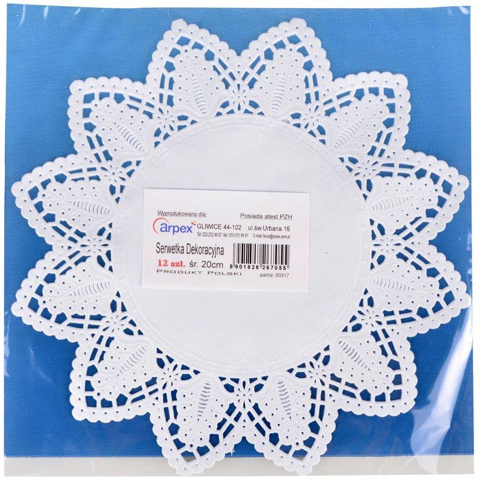 SERWETKI PAPIEROWE DEKORACYJNE OKRĄGŁE 20CM 12 SZTUK KAJMSerwetki białe pod tort.Wymiary: 20 cmIlość sztuk w opakowaniu: 12Materiał: papierKolor: białyCena za opakowanie (12 sztuk)EAN:5901828267055