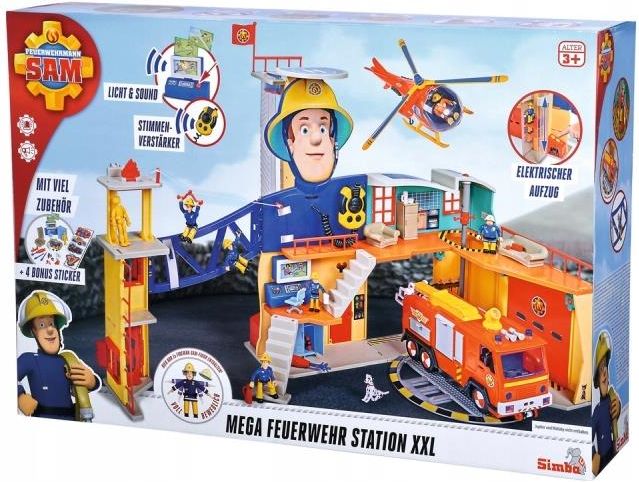 Remiza Strażaka Sama XXL gwarantuje wiele opcji zabawy, jest tu elektryczna winda, obrotowa platforma dla pojazdów, lądowisko dla helikoptera, wieża treningowa z manekinem, strzałki wodne z tworzywa, mikrofon, otwierana brama garażowa, pomieszczenia na parterze i piętrze (są wyposażone w mebelki), …