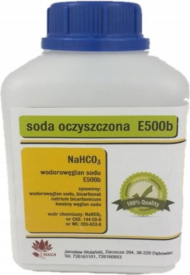 SODA OCZYSZCZONA 500 g - YUCCA E500b - NaHCO3 - soda spożywcza Soda oczyszczona ma wiele właściwości, dlatego znalazła szerokie zastosowanie w lecznictwie, kuchni, kosmetyce i nie tylko Zastosowanie: do pieczenia pierników (1 łyżeczka na 500g mąki); na problemy żołądkowe (1 łyżeczka na szklankę …