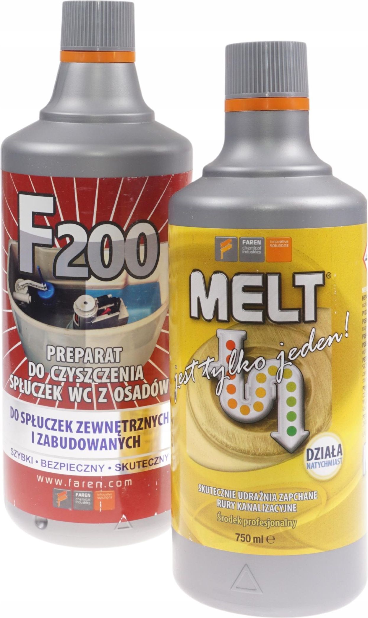 ZESTAW Środków czyszczących Melt + F200 1 x Melt - Preparat do odblokowywania zatkanych rur kanalizacyjnych 750mll + 1 x F200 - Mocny środek do czyszczenia z osadów w toalecie 1000ml Melt Preparat do odblokowywania zatkanych rur kanalizacyjnych: Odblokowuje zupełnie zatkane rury, DZIAŁA NATYCHMIAST …
