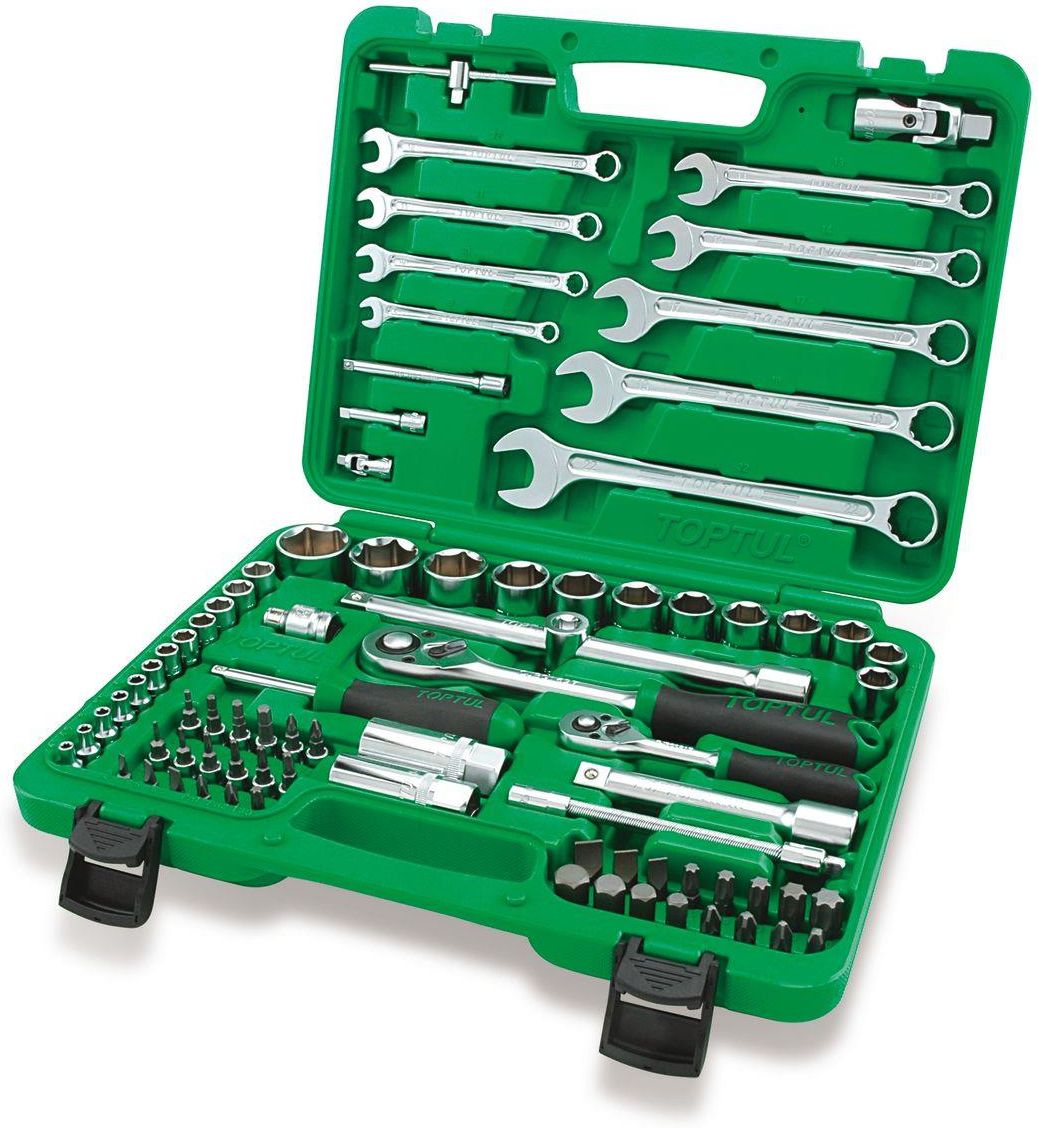 Uniwersalny zestaw narzędzi TOTPUL 82 elementów łącząc kwadraty 1/4" i 1/2" Przeznaczone do pracy z elementami złącznymi różnego typu i kształtu Zestaw narzędzi znajdzie zastosowanie w produkcji, w serwisach samochodowych, w warsztatach samochodowych, w domu, w domu, w ogrodzie, w prywatnym garażu. Ten zestaw łączy w sobie wszystkie najczęściej używane narzędzia, mając taki zestaw zawsze masz pewność, że każde narzędzie jest w pobliżu. Każde narzędzie ma swoje miejsce, zawsze zobaczysz, gdzie odłożyć używane narzędzie, a także zauważysz, czy czegoś nie brakuje w zestawie. Narzędzie wykonane jest wyłącznie z wysokiej jakości materiałów, wytrzymałej stali narzędziowej ze stali chromowo-wanadowej (CRMO) i spełnia międzynarodowe standardy jakości, co potwierdzają liczne międzynarodowe certyfikaty. Trwałe odporne na ścieranie satynowe wykończenie jest przyjemne w dotyku i trwałe w użytkowaniu. Dwukomponentowe, ergonomiczne, antypoślizgowe rękojeści narzędzia wykonane są z wysokiej jakości tworzywa sztucznego z gumowymi wstawkami. Wygodna obudowa wykonana jest z odpornego na wstrząsy tworzywa sztucznego. Mocne i niezawodne zatrzaski nie pozwolą na otwarcie walizki podczas transportu. Jakość i niezawodność narzędzi TOPTUL jest zawsze na najwyższym poziomie. Zestaw zawiera 82 elementów najpotrzebniejszego narzędzia: Nasadki od 4 mm do 32 mm Przedłużki w różnych rozmiarach Adaptery Różne kwadraty łączące Bity do pracy z małymi elementami złącznymi Bity z wciskanymi bitami Wały kardana dla łatwego dostępu do różnych jednostek i zespołów