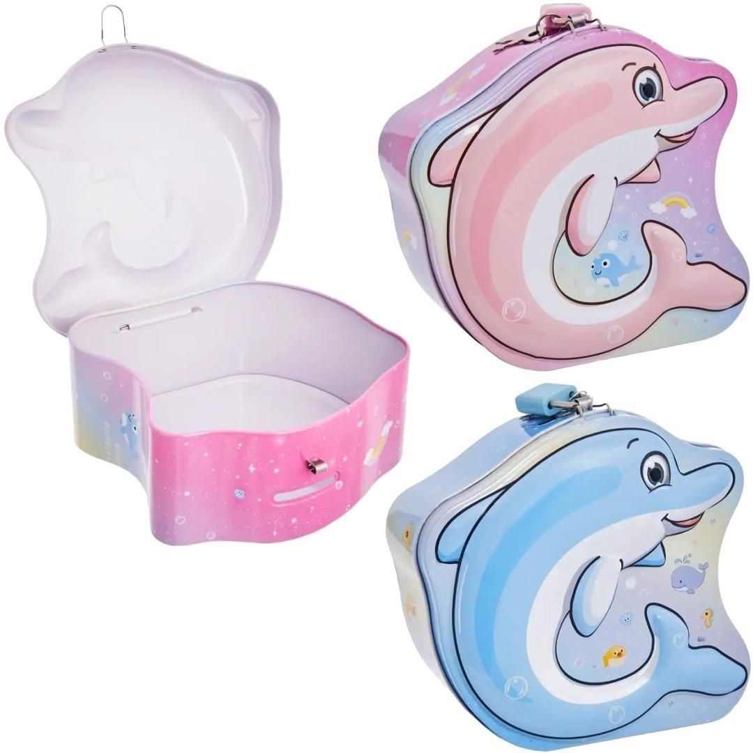 Magiczna Skarbonka Delfin z Kłódką - Płyń po Marzenia i Oszczędzaj jak Rybka! Zanurz się w podwodny świat oszczędzania z naszą uroczą metalową skarbonką w kształcie uśmiechniętego delfina! To idealny sposób, aby zachęcić dzieci do zbierania pieniędzy w zabawny, bezpieczny i pełen fantazji sposób. …