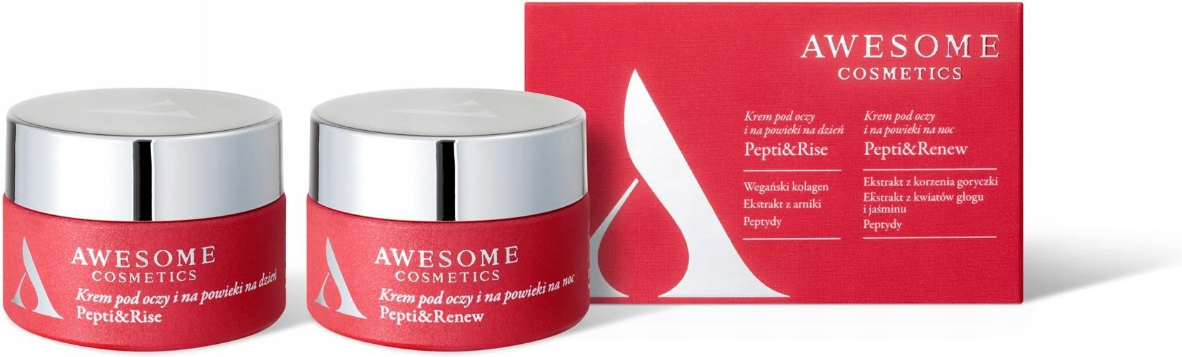 Awesome Cosmetics - Zestaw kremów pod oczy i na powieki dzień/noc Pepti&Rise i Pepti&Renew 2x10ml Dla każdego rodzaju skóry, w tym wrażliwej Poznaj unikalny na rynku zestaw kremów pod oczy i na powieki z peptydami. Jedno opakowanie = dwa kremy i całodobowe działanie, które zapewni Twojej …