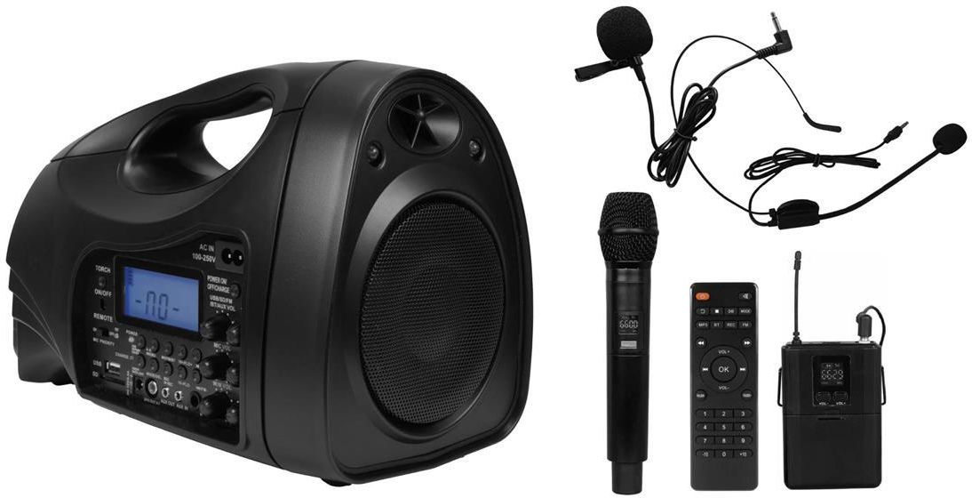 Power audio MUSICMATE MM-SS340 Gallard Przenośne nagłośnienie Świetny wybór na każdą okazję Jeśli szukasz solidnego i wszechstronnego rozwiązania nagłośnieniowego, nasz zestaw MUSICMATE MM-SS340 Gallard spełni Twoje oczekiwania. Bez względu na to, czy organizujesz małe spotkanie, czy dużą imprezę, ten zestaw zapewni Ci odpowiednią jakość dźwięku i funkcjonalność. Wszechstronny zestaw Przenośny zestaw nagłośnieniowy MUSICMATE MM-SS340 Gallard to idealne rozwiązanie dla instruktorów, przewodników, trenerów, solistów, konferansjerów oraz podczas spotkań, prezentacji, szkoleń, imprez i pochodów. W skład zestawu wchodzą: bezprzewodowy mikrofon nagłowny, bezprzewodowy mikrofon ręczny, przewodowy mikrofon krawatowy i przewodowy mikrofon ręczny, kabel AUX, pasek na ramię, pilot zdalnego sterowania oraz kabel do ładowania sieciowego. Funkcjonalność i wygoda Zestaw umożliwia odtwarzanie muzyki z różnych źródeł, takich jak nośniki USB-A, karty SD, AUX oraz Bluetooth. Dzięki funkcji nagrywania i wbudowanemu radiu FM możesz cieszyć się ulubionymi stacjami radiowymi lub nagrywać swoje występy. Wyświetlacz LED oraz funkcja latarki dodatkowo zwiększają komfort użytkowania w każdych warunkach. Długi czas pracy Urządzenie pozwala na pracę do 10 godzin przy pełnym naładowaniu, co sprawia, że jest idealne na długie wydarzenia bez potrzeby ciągłego ładowania. Możliwość jednoczesnego korzystania z trzech mikrofonów pozwala na interakcję z wieloma osobami naraz, co jest niezwykle przydatne podczas szkoleń czy prezentacji. Uniwersalne zastosowanie Dzięki swojej wszechstronności, zestaw może być używany w różnych sytuacjach – od treningów i warsztatów, przez występy sceniczne, aż po wydarzenia plenerowe. Kompaktowy design i dołączony pasek na ramię umożliwiają łatwe przenoszenie, a pilot zdalnego sterowania pozwala na pełną kontrolę bez potrzeby podchodzenia do urządzenia. Zawartość opakowania Power audio MUSICMATE MM-SS340 Gallard, ręczny mikrofon bezprzewodowy, mikrofon krawatowy, mikrofon nagłowny, transmiter bezprzewodowy do mikrofonu krawatowego i nagłownego, pilot zdalnego sterowania, pasek na ramię, kabel sieciowy do ładowania, instrukcja obsługi, karta gwarancyjna. Specyfikacja Moc znamionowa RMS [W]: 125 Typ kolumn: Pełnozakresowe Korektor dźwięku: Tak Rodzaj odtwarzanych płyt: Nie dotyczy Obsługiwane formaty: MP3 Radio: FM Wbudowana bateria: Tak Informacje dodatkowe: Uchwyt do przenoszenia Odporność na zachlapanie: Tak Czas pracy na baterii [h]: 10 Wi-Fi: Nie Bluetooth: Tak NFC: Nie AirPlay: Nie DLNA: Nie Podbicie basu: Tak Karaoke: Tak Funkcje dodatkowe: Czytnik kart SD, Funkcja latarki, Funkcja nagrywania Mikrofon w zestawie: Tak Dla dzieci: Nie Odtwarzacz płyt: Nie Cyfrowe złącze koaksjalne: Nie Cyfrowe złącze optyczne: Nie Wejście antenowe: Nie Wejście liniowe audio AUX: Tak Wyjście AV: Nie Wyjście do aktywnego subwoofera: Nie Wyjście komponentowe: Nie Wyjście słuchawkowe: Tak Złącze EURO: Nie Złącze HDMI: Nie Złącze USB: Tak Wymiary [cm]: 32 x 17.5 x 21 Waga [kg]: 2.5 Waga z opakowaniem [kg]: 2.9 Kolor obudowy: Czarny Wyposażenie: Kabel zasilający, Mikrofon bezprzewodowy, Mikrofon krawatowy, Mikrofon nagłowny, Mikrofon przewodowy, Pasek na ramię, Pilot, Transmiter bezprzewodowy Załączona dokumentacja: Instrukcja obsługi w języku polskim, Karta gwarancyjna