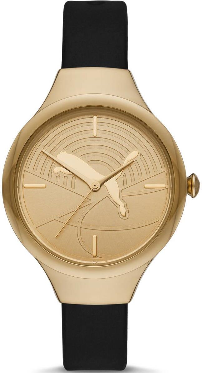 Puma Contour P1054 Ladies Watch Stainless steel case, gold colored coating, polished Silicone strap, black, pin buckle Quartz movement, battery operated 3 ATM Water Resistant Dial color gold Case width ca. 37 mm Case height around 7 mm Comes with booklet and box.