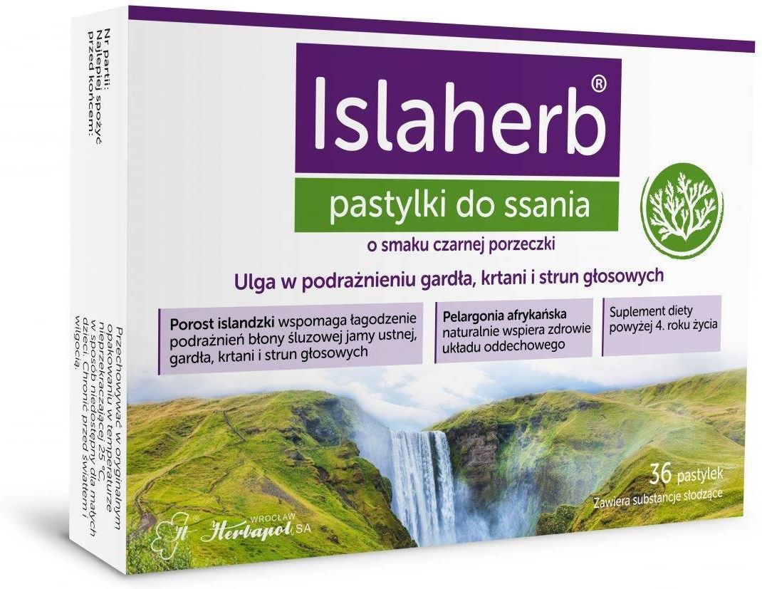 OPIS PRODUKTU Islaherb, pastylki do ssania to suplement diety przeznaczony dla dzieci powyżej 4. roku życia, młodzieży i osób dorosłych. Produkt zawiera kompozycję naturalnych ekstraktów z porostu islandzkiego, przynoszącego ulgę w przypadku podrażnionej błony śluzowej jamy ustnej, krtani, gardła i strun głosowych, korzenia pelargonii afrykańskiej o działaniu kojącym drogi oddechowe, kwiatu dziewanny oraz witaminę C, wspomagającą prawidłowe funkcjonowanie układu odpornościowego. DZIAŁANIE Suplement diety przynosi ulgę osobom borykającym się z uczuciem podrażnienia i drapania w gardle. Ekstrakt z plechy porostu islandzkiego wspomaga łagodzenie podrażnień błony śluzowej jamy ustnej, gardła, krtani i strun głosowych. Ekstrakt z korzenia pelargonii afrykańskiej wspiera utrzymanie zdrowia dróg oddechowych. Witamina C wspomaga prawidłowe funkcjonowanie układu odpornościowego. SKŁAD Substancja słodząca: syrop maltitolowy, stabilizator: guma arabska, substancja słodząca: sorbitol, ekstrakt z plechy porostu islandzkiego ( Cetraria islandica L.), kwas L-askorbinowy (witamina C), regulator kwasowości: kwas cytrynowy, ekstrakt z kwiatów dziewanny drobnokwiatowej ( Verbascum thapsus L.), ekstrakt z korzenia pelargonii afrykańskiej ( Pelargonium sidoides L.) standaryzowany na taniny, aromat czarnej porzeczki, substancje glazurujące: wosk Carnauba, olej kokosowy, wosk pszczeli, substancja słodząca: acesulfam K, barwnik: antocyjany. Produkt może zawierać śladowe ilości orzechów, orzeszków ziemnych, soi, mleka i glutenu. Bez dodatku cukru. SPOSÓB UŻYTKOWANIA Pastylki należy powoli ssać do całkowitego rozpuszczenia w jamie ustnej. Ssać po 1 pastylce od 1 do 6 razy dziennie. Zalecane dzienne spożycie: dzieci od 4. do 6. roku życia – 2 pastylki dziennie, dzieci od 6. do 12. roku życia – 4 pastylki dziennie, dzieci powyżej 12. roku życia i dorośli – 6 pastylek dziennie. PRZECIWWSKAZANIA Nie należy przekraczać porcji zalecanej do spożycia w ciągu dnia. Spożycie w nadmiernych ilościach może mieć efekt przeczyszczający. PRODUCENT Wrocławskie Zakłady Zielarskie „Herbapol” SA 50-951 Wrocław, ul. św. Mikołaja 65/68 www.herbapol.pl