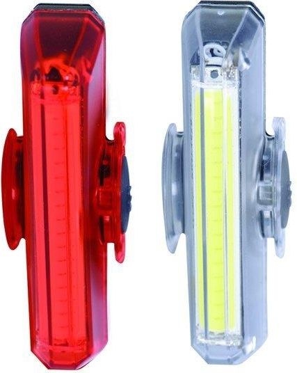 Akumulator litowo- jonowy ładowany przez USBDioda LED COB - przód - 100 lumenów | tył - 50 lumenówZintegrowany uchwyt do wspornika siodła i na kierownicę, montaż bez użycia narzędziW zestawie kabel micro USB i gumowe paskiCzas pracy: Tryb | Czas działania Przód | Czas działania TyłWysoki ciągły | 2 godz. | 2 godz.Średni ciągły | 4 godz. | 4 godz.Niski ciągły | 6 godz. | 8godz.Eco ciągły | 12 godz. | 15 godz.Wolny migający niska jasność | 45 godz. | 45 godz.Wolny migający średnia jasność | 9 godz. | 10 godz.Wolny migający wysoka jasność | 5 godz. | 6 godz.Szybki migający wysoka jasność | 18 godz. | 23 godz.Szybki migający średnia jasność | 23 godz. | 23 godz....