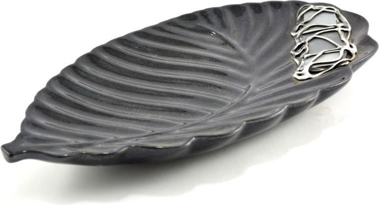 Szara ceramiczna patera w kształcie liścia z prawej górnej strony posiada ozdobny wzór. Produkt nie posiada opakowania.
