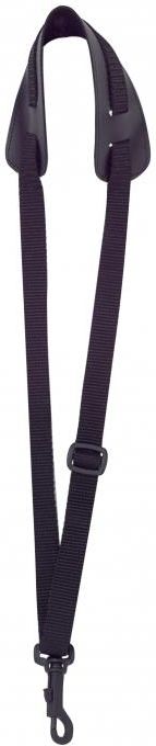 Czarna nylonowa taśma paska o szerokości 2,5 cm 6-cio centymetrowa nakładka na kark Stabilny karabinek z tworzywa sztucznego Dzięki zmienionej konstrukcji pasek jest wyjustowany na prawidłową długość Przy wkładaniu i ściąganiu paska niepotrzebne jest żadne przestawianie