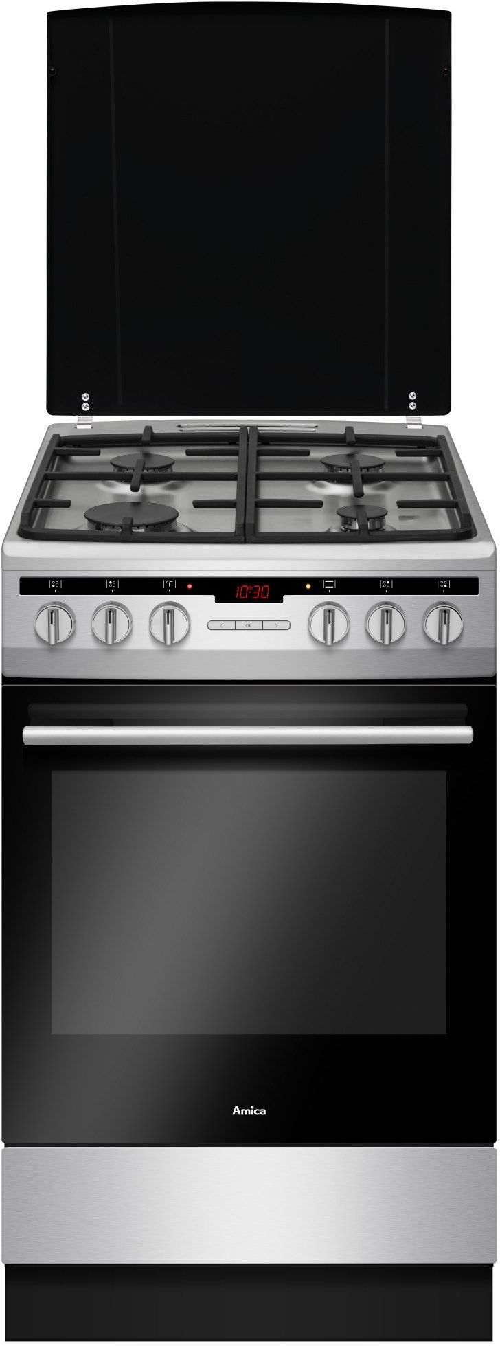 AMICA Kuchnia gazowo-elektryczna 57GE3.33HZpTaDA(Xx) PIZZA 57GE3.33HZpTaDA(Xx) PIZZA Funkcja PIZZA 300°C - Specjalnie dobrane parametry pieczenia - wysoka temperatura 300°C, równomierna cyrkulacja powietrza oraz siła dolnej grzałki sprawiają, że domowa pizza ma idealnie chrupiące, podpieczone od spodu ciasto oraz nie przesuszone składniki. I jest gotowa w kilka minut! Chłodny front drzwi - zastosowanie konstrukcji 3-szybowej oraz wewnętrznej szyby refleksyjnej pozwala zdecydowanie zmniejszyć temperaturę na froncie piekarnika. Szybki nagrzew - Piekarnik osiąga temperature 150°C w 4 minuty, to o 20% szybciej w porównaniu ze standardami. Rozmrażanie - funkcja idealna do rozmrażania potraw takich jak mięso, ryby, pieczywo czy ciasta. Timer Ta - zapewnia swobodę programowania godziny wyłączenia oraz czas grzania piekarnika. Stabilne ruszty żeliwne - są bardziej wytrzymałe i stabilne, a jednocześnie bardzo łatwe do utrzymania w czystości. Budowa : gazowo-elektryczna Liczba palników / pól grzejnych: 4 Informacje o płycie : 4,0 cm palnik pomocniczy 2 x 6,5 cm palnik średni 9,0 cm palnik duży Zabezpieczenie przeciwwypływowe gazu Ruszty żeliwne Zwiększona płaszczyzna robocza rusztu Elektryczny zapalacz gazu w pokrętle Płyta kuchenna: emalia Pojemność: 66 l Termoobieg: tak Programator elektroniczny: tak Funkcje piekarnika : pizza,szybkie nagrzewanie piekarnika (FastPreheat) Pozostałe funkcje: Liczba funkcji: 10 Drabinki Chłodny front drzwi (3 szyby) Emalia łatwoczyszcząca Steam Clean czyszczenie parowe Nakrywa lakierowana Szuflada na prowadnicach rolkowych Klasa energetyczna: A Kolor: inox Wysokość: 85 cm Szerokość: 50 cm Głębokość: 60 cm Waga: 41.1 kg Pozostałe parametry: Opiekacz elektryczny: 2000 W Grzałka górna: 900 W Grzałka dolna: 1100 W Grzałka pierścieniowa termoobiegu: 2000 W Moc całkowita: 3,100 kW