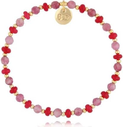 Surowiec: mosiądz. Kolor surowca: złoty. Kamienie: różowe turmaliny, jadeity. Wielkość kamieni: 0,42 cm ; 0,46 cm Wielkość bransoletki: 5,00 cm bez rozciągania.