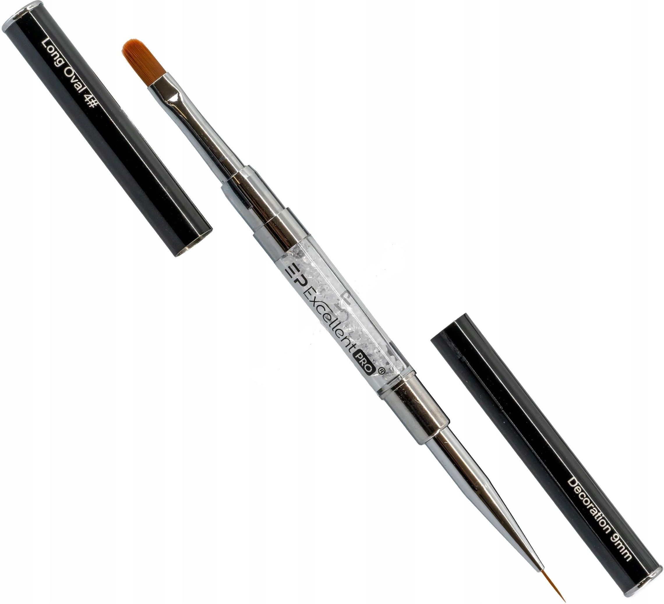 Excellent PRO pędzelek 2w1 do żelu owal #4 i do zdobień 9mm EXCELLENT PRO PĘDZELEK 2IN1 Z CYRK. LONG OVAL #4 DECO #9 - to dopracowany w najmniejszym szczególe dwustronny pędzelek niezbędny podczas wykonywania stylizacji żelowych. Łączy w jeden przyrząd pędzelek do nakładania żelu o owalnym zakończeniu, które pozwala na jeszcze precyzyjniejsze dotarcie do wałów okołopaznokciowych z pędzelkiem o cienkim włosiu, który świetnie sprawdzi się do poprawiania linii światła a także do wykonywania zdobień np. french. Końcówka OVAL #4 posiada idealnie wyważone, zwężane włosie o długości 11mm i szerokości 5mm. DECO #9 jest pędzelkiem z włosiem o długości 9mm. Połączenie dwóch pędzelków w jeden pomoże przyśpieszyć tempo pracy oraz zminimalizować ilość akcesoriów na stanowisku pracy. Idealnie sprawdzi się w metodzie bez piłowania. Pędzelek wykonany z wysokiej jakości włosia syntetycznego, które cechuje się niezwykłą trwałością i odpornością na składniki chemiczne, co zapewni jego trwałość na długi czas. Zamykane skuwki zabezpieczą włosie przed ewentualnymi uszkodzeniami i zniszczeniem.