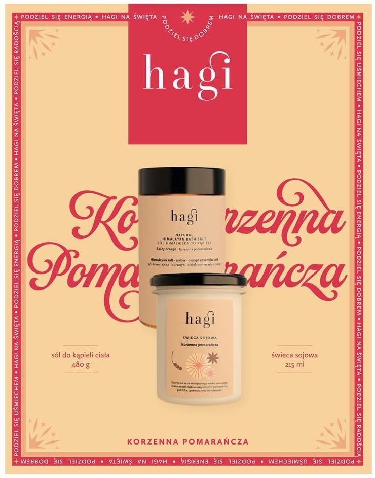 Hagi Zestaw Korzenna Pomarańcza Sól do Kąpieli + Świeca Sojowa Hagi Zestaw Korzenna Pomarańcza to idealny pomysł na prezent dla miłośników relaksu i domowego SPA. Połączenie soli do kąpieli i świecy sojowej z bestsellerowej linii Spicy Orange zamienia zwykły wieczór w aromatyczną ucztę dla zmysłów. Sól do kąpieli otula ciało pielęgnującą mieszanką minerałów, które regenerują i odprężają skórę. Towarzyszy jej świeca sojowa o zapachu soczystych pomarańczy, cynamonu i miodu - roztacza ciepły, korzenny aromat, tworząc atmosferę spokoju i wyciszenia. Wspólnie tworzą rytuał, który koi ciało i umysł. Zestaw Hagi Korzenna Pomarańcza to wyjątkowa propozycja zarówno dla siebie, jak i na prezent - idealna na chłodne wieczory, gdy potrzebujesz chwili relaksu i odprężenia w blasku świecy i zapachu natury. Korzyści ze stosowania - Aromatyczny rytuał relaksu i odprężenia - Zmysłowy zapach pomarańczy, cynamonu i miodu - Regeneracja i odżywienie skóry dzięki soli mineralnej - Naturalne, wegańskie składniki i ekologiczna świeca sojowa Zawartość zestawu • Sól do kąpieli Korzenna Pomarańcza 480g • Świeca sojowa Korzenna Pomarańcza 215ml