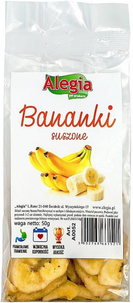 Przysmak Banany suszone Alegia to idealny naturalny przysmak dla gryzoni i królików. Przysmak Banany suszone 50g Alegia to doskonałe urozmaicenie diety gryzoni i królików, która dostarcza niezbędnych składników mineralnych i witamin. To w 100 % naturalny, zdrowy przysmak który zawiera m in. potas, witaminę C i B oraz magnez. Ze względu na zawartość cukru nie należy podawać ich koszatniczkom! Chipsy bananowe 50g stanowią idealny dodatek do codziennego karmienia gryzoni i królików, dostarczy Twojemu pupilowi energii której tak bardzo potrzebuję. Przysmak chętnie zje każdy gryzoń oraz króliczek. Produkt w 100% naturalny. Nie barwiony, nie pryskany, nie posiada żadnych preparatów czy aromatów lub barwników. Pakowany ręcznie. NatiAnimals – Artykuły akwarystyczne, terrarystyczne i zoologiczne od renomowanych producentów Sklep internetowy NatiAnimals oferuje szeroki wybór artykułów akwarystycznych, terrarystycznych i zoologicznych od uznanych producentów, które zapewnią Twoim zwierzętom optymalne warunki życia oraz doskonałą pielęgnację. Artykuły akwarystyczne – Wszystko, czego potrzebujesz do swojego akwarium W NatiAnimals znajdziesz kompleksowe wyposażenie do akwarium, takie jak filtry, oświetlenie, pokarmy, rośliny oraz ozdoby, które zapewnią idealne warunki dla ryb i innych wodnych zwierząt. Nasze produkty pochodzą od renomowanych marek, gwarantujących najwyższą jakość. Akcesoria terrarystyczne – Zadbaj o swoje egzotyczne zwierzęta Oferujemy również szeroką gamę produktów terrarystycznych, w tym terraria, oświetlenie, systemy grzewcze oraz karmy dla gadów, płazów i innych egzotycznych zwierząt. Nasze akcesoria pomagają w stworzeniu zdrowego i bezpiecznego środowiska dla Twoich podopiecznych. Artykuły zoologiczne – Kompleksowa opieka nad zwierzętami domowymi W NatiAnimals znajdziesz wszystko, czego potrzebujesz dla swoich zwierząt domowych – od karm i suplementów, po akcesoria do pielęgnacji i zabawki. Dzięki produktom od renomowanych producentów możesz zapewnić swojemu pupilowi najlepszą opiekę. NatiAnimals – Twój zaufany sklep dla miłośników zwierząt Odkryj szeroką ofertę artykułów akwarystycznych, terrarystycznych i zoologicznych w NatiAnimals i zapewnij swoim zwierzętom komfort oraz zdrowie. Wybierz sprawdzone produkty od renomowanych marek, które pokochają zarówno Ty, jak i Twoje zwierzaki!