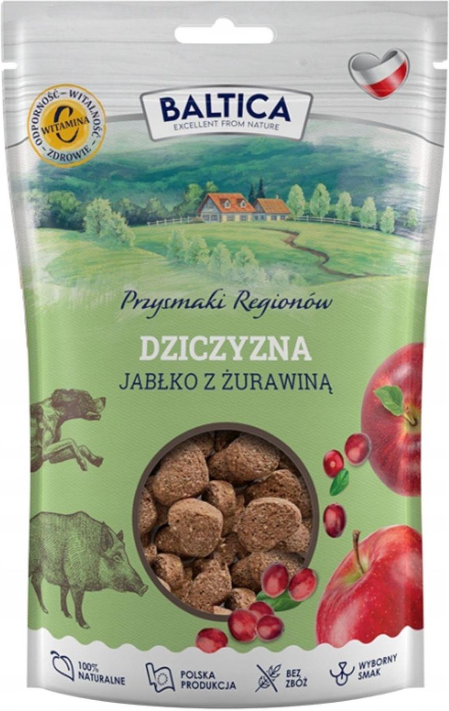 Baltica Przysmaki Regionów Dziczyzna z Jabłkiem 600g Baltica Przysmaki Regionów Dziczyzna z Jabłkiem to wyjątkowe, treningowe smaczki stworzone na bazie wybornego mięsa dzika, wzbogacone o owoce polskiej jabłoni i żurawinę. Te 600-gramowe przysmaki zostały zaprojektowane specjalnie z myślą o jednorazowym podaniu podczas treningu, dzięki czemu nie brudzą rąk ani kieszeni. Kluczowe Zalety Przysmaków: Hipoalergiczne i Przyjazne dla Wrażliwych Psów: Przysmaki są rekomendowane dla alergików oraz psów z wrażliwym układem pokarmowym, ponieważ nie zawierają zbóż, sztucznych barwników, konserwantów ani aromatów. Wsparcie dla Układu Moczowego i Odporności: Zawierają witaminę C i E, które pozytywnie wpływają na prawidłowe funkcjonowanie układu moczowego, doskonałą kondycję mięśni oraz codzienną odporność i ogólne zdrowie psa. Wysoka Jakość Składników: Głównym składnikiem jest suszone mięso z dzika (45%), uzupełnione ziemniakami, jabłkiem (4%), żurawiną (4%), pulpą buraczaną, minerałami oraz 1,3/1,6 beta glukanem, wspierającym odporność. Naturalnie Konserwowane: Przysmaki są konserwowane naturalnie mieszanką tokoferoli, co zapewnia ich świeżość bez użycia sztucznych substancji. Składniki Analityczne i Dodatki: Białko: 33% Tłuszcz: 12% Włókno: 2,8% Popiół: 10% Wartość energetyczna: 3227 kcal/kg Dodatki technologiczne/kg: Witamina C: 40 mg Witamina E: 100 mg Ekstrakt tokoferoli z olei roślinnych. Zastosowanie: Zalecane dawkowanie to do 50 g / 10 kg masy ciała dziennie. Zawsze należy zapewnić psu dostęp do świeżej, chłodnej wody. Baltica Przysmaki Regionów Dziczyzna z Jabłkiem to doskonały wybór dla każdego psa, który potrzebuje zdrowej, smacznej i funkcjonalnej nagrody podczas treningu, szczególnie dla psów z alergiami lub wrażliwym układem pokarmowym.