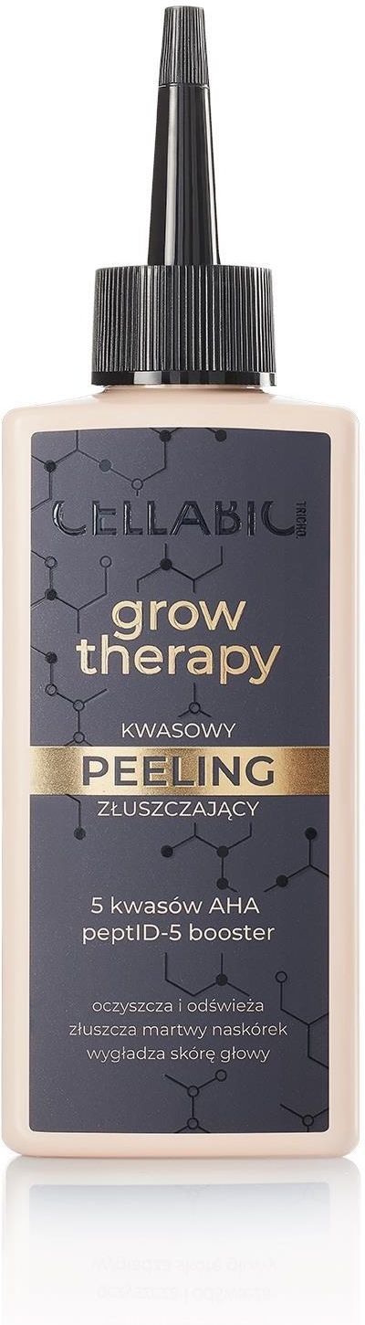 Cellabic Tricho Grow Therapy Kwasowy peeling złuszczający dla mężczyzn 150ml Poznaj Cellabic Tricho – markę, która powstała z pasji do pięknych, zdrowych włosów zarówno dla kobiet, jak i mężczyzn.Wierzymy, że zdrowie włosów zaczyna się od skóry głowy, dlatego stworzyliśmy produkty, które zapewniają kompleksową pielęgnację – od ich wzmacniania, przez regenerację, po ochronę przed szkodliwymi czynnikami.Nasze innowacyjne formuły łączą naturalne składniki z zaawansowanymi badaniami naukowymi, zapewniając efektywną pielęgnację, której efekty widać i czuć już po pierwszym użyciu.Zadbaj o swoje włosy w oparciu o moc nauki, która wspiera ich regenerację i wzrost.Co nas wyróżnia?- Produkty oparte na peptydowych czynnikach wzrostu, które stymulują włosy do zdrowego wzrostu- Zaufanie ekspertów trychologii – potwierdzona skuteczność- Skuteczne formuły- Kompleksowa linia produktów: szampony, odżywki, peelingi, wcierki i serumCellabic Tricho to pielęgnacja dla każdego – dla kobiet i mężczyzn, którzy chcą dbać o swoje włosy. Codzienna rutyna nigdy nie była tak prosta i skuteczna Oczyszczenie, Regulacja Sebum, Wzrost Włosów Kwasowy peeling złuszczający z serii Grow Therapy to idealne rozwiązanie dla mężczyzn z problemami przetłuszczającej się skóry głowy, łupieżu i wypadania włosów. Dzięki połączeniu 5 kwasów AHA oraz peptID-5 booster, peeling intensywnie złuszcza martwy naskórek, oczyszcza skórę głowy i wspiera wzrost nowych włosów. Regularne stosowanie peelingu zmniejsza przetłuszczanie skalpu i poprawia kondycję skóry głowy. Składniki aktywne 5 kwasów AHA – Złuszczają martwy naskórek, pozostawiając skórę głowy odświeżoną i gotową na kolejne kroki pielęgnacji. peptID-5 booster – Kompleks peptydów stymulujących wzrost nowych włosów i wspierających ich zdrowy wygląd. Ekstrakt z eukaliptusa – Wspomaga prawidłową pielęgnację skóry głowy, tworząc optymalne warunki do wzrostu włosów. Działanie peelingu Intensywne oczyszczanie – Skutecznie usuwa zanieczyszczenia, martwy naskórek, nadmiar sebum oraz resztki kosmetyków stylizujących. Reguluje wydzielanie sebum – Zmniejsza przetłuszczanie się skóry głowy, co pomaga w utrzymaniu świeżości włosów na dłużej. Wspiera wzrost włosów – Poprawia mikrokrążenie i odblokowuje mieszki włosowe, co sprzyja wzrostowi nowych, mocniejszych włosów. Sposób użycia Nakładaj peeling równomiernie na suchą skórę głowy, wykonaj delikatny masaż. Pozostaw na 2–5 minut, a następnie dokładnie spłucz. Stosuj raz w tygodniu. Peeling nie nadaje się do stosowania na podrażnioną skórę. Aby uzyskać najlepsze efekty, stosuj regularnie w połączeniu z innymi produktami z serii Grow Therapy. Dla kogo Polecany szczególnie dla mężczyzn borykających się z nadmiernym przetłuszczaniem się skóry głowy, łupieżem oraz zwiększoną tendencją do wypadania włosów. Przygotowanie i stosowanie: nakładaj produkt równomiernie na suchą skórę głowy. Wykonaj delikatny masaż. Spłucz dokładnie po upływie 2-5 minut. Stosuj raz w tygodniu. Dla uzyskania najlepszych efektów używaj regularnie łącznie z pozostałymi produktami z serii grow therapy. Skład Aqua, Glycerin, Propanediol, Hydroxyethyl Urea, Lactic Acid, Panthenol, Glycolic Acid, Malic Acid, Tartaric Acid, Citric Acid, Eucalyptus Globulus Leaf Extract, Saccharum Offcinarum (Sugarcane) Extract, Citrus Aurantium Dulcis (Orange) Fruit Extract, Citrus Limon (Lemon) Fruit Extract, Acer Saccharum (Sugar Maple) Extract, Foeniculum Vulgare Fruit Extract, Acetyl Tetrapeptide-3, Trifolium Pratense (Clover) Flower Extract, sh-Oligopeptide-10, sh-Oligopeptide-2, sh-Polypeptide-1, sh-Polypeptide-11, sh-Polypeptide-9, Sodium Hyaluronate, Butylene Glycol, Epilobium Angustifolium Flower/Leaf/Stem Extract, Lecithin, Arginine, Caprylyl Glycol, Vaccinium Myrtillus Fruit Extract, Tocopherol, Dextran, Anetholea Anisata Leaf Extract, Coco-Glucoside, Xantan Gum, Alcohol, Phenoxyethanol, Ethylhexylglycerin, Potassium Sorbate, Sodium Benzoate, Parfum