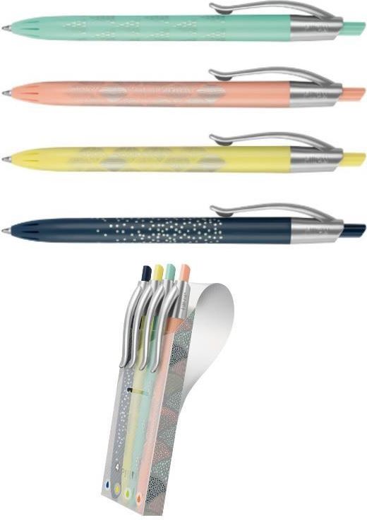 Długopisy P1 SILVER w elastycznym etui. Obudowa srebrna, przyciski i klips w tym samym kolorze co kolor tuszu: niebieskim, żółtym, różowym, zielonym. Pstrykane. Etui pozwala złożyć pokrywkę i ustawić długopisy w wygodnej pozycji biurkowej. Przybliżona długość pisania: 1200 metrów. Końcówka 1 mm. …