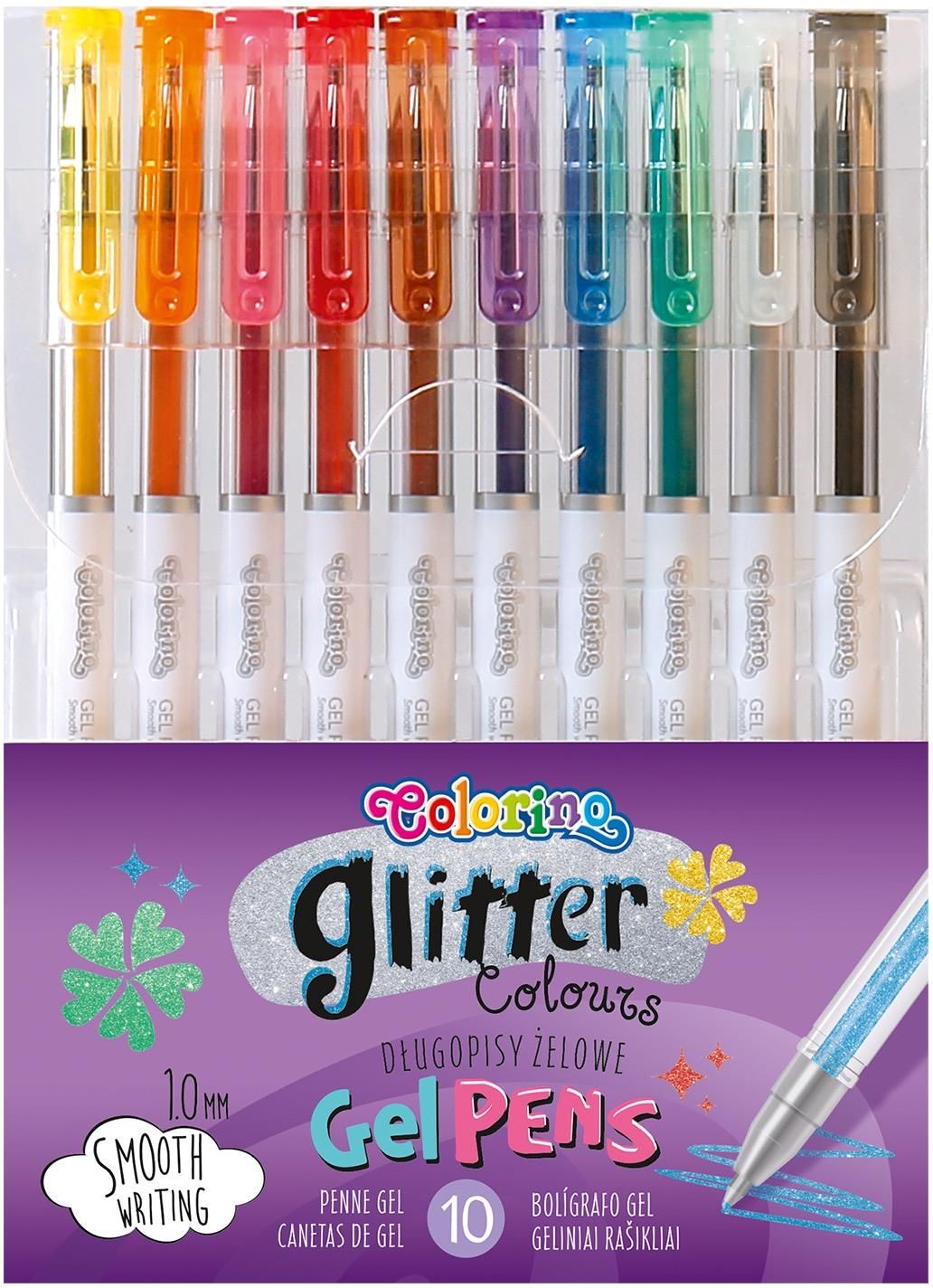 Brokatowe długopisy żelowe z delikatnymi drobinkami pozostawiającymi piękny połysk. Fantastyczne do pisania, rysowania oraz podkreślania. Jednolita, błyszcząca linia o grubości 1mm. 10 kolorów