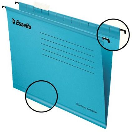 Teczki zawieszane Esselte Classic niebieskie 25szt Bardzo wytrzymale teczki zawieszane w intensywnych kolorach. Dno teczki oraz listwa z zawieszkami wzmocniona specjalna folią, co czyni ją 10 razy mocniejszą od poprzedniej wersji. Atrakcyjne, intensywne kolory umozliwiają organizacje dokumentów w …