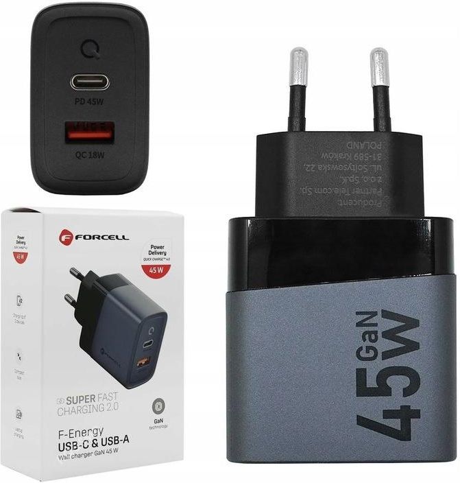 Ładowarka Sieciowa Forcell F-Energy GaN - 45W 1x USB-C | 1x USB-A | Power Delivery | Quick Charge™ 4.0 | Super Fast Charging 2.0 oryginalny produkt Forcell kolor grafitowo-czarny port USB-C PD 45W⚡ port USB QC 18W moc 45W szybkie ładowanie Power Delivery szybkie ładowanie Quick Charge 4.0 szybkie …