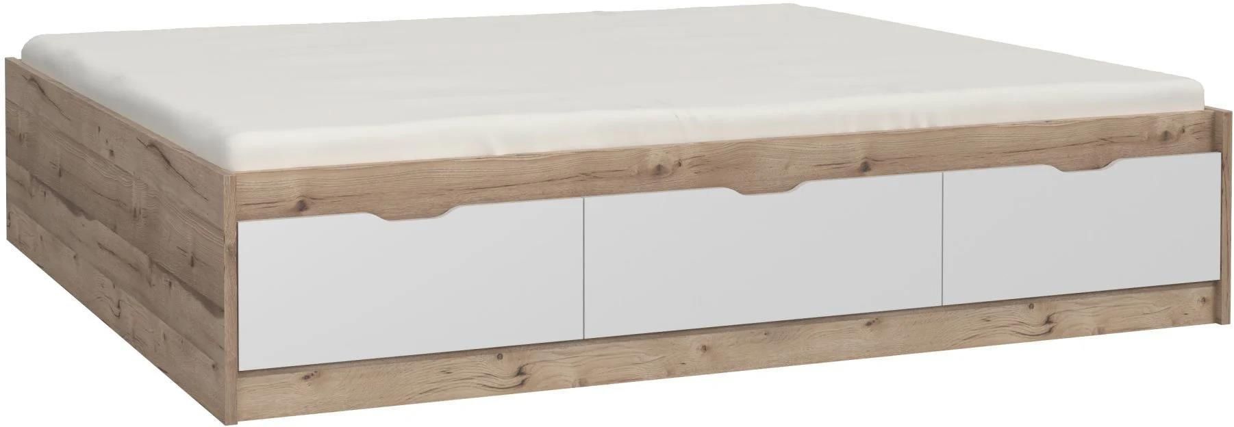 Stelaż łóżka Vankka, producenta Meble Forte, to uniwersalny mebel do sypialni dla dwojga. Jego wymiary pozwalają umieścić w ramie materac w rozmiarze aż 180x200 cm, co stanowi wyjątkowo komfortową powierzchnię spania dla dwóch użytkowników. Atutem mebla jest również obecność szuflad, które tworzą w sypialni dodatkowe miejsce do przechowywania na tekstylia czy rzadziej używane przedmioty. Jak zbudowane jest łóżko sypialniane Vankka? Łóżko z szufladami z kolekcji Vankka nie posiada zagłówka, co pozwala postawić je w sypialni w dowolnym miejscu. Mebel został wykonany z wysokiej jakości płyty meblowej, odpornej na uszkodzenia i niewymagającej w pielęgnacji. Rama oferuje użytkownikowi dodatkowe trzy szuflady na sprawdzonych prowadnicach kulkowych. Można więc wygodnie przechowywać w nich zarówno pościel, koce czy poduszki, jak i rzadziej używaną odzież i inne przedmioty. Dostęp do zawartości mebla użytkownik zachowuje dzięki podfrezowanym frontom, które podkreślają minimalistyczny design łóżka. W jakiej sypialni sprawdzi się łóżko dwuosobowe Vankka? Prezentowane łóżko skandynawskie Vankka zostało wybarwione na dekor Biały i Deska Dębowa, co stanowi typowe połączenie kolorystyczne dla tego stylu aranżacyjnego. Mebel wyróżnia się prostą linią, pasującą do wnętrz nowoczesnych. Dzięki jasnym dekorom rozświetla i optycznie powiększa każdy pokój. Natomiast za sprawą rysunku drewna dodaje wnętrzu elegancji, ciepła i przytulności. Łóżko sprawdzi się w sypialni dla dwojga, łącząc dużą powierzchnię spania z dodatkowym miejscem do przechowywania, które ułatwi utrzymanie nienagannego porządku w pomieszczeniu. Wymiary łóżka Szerokość: 190,5 cm Głębokość: 204,9 cm Wysokość: 43 cm
