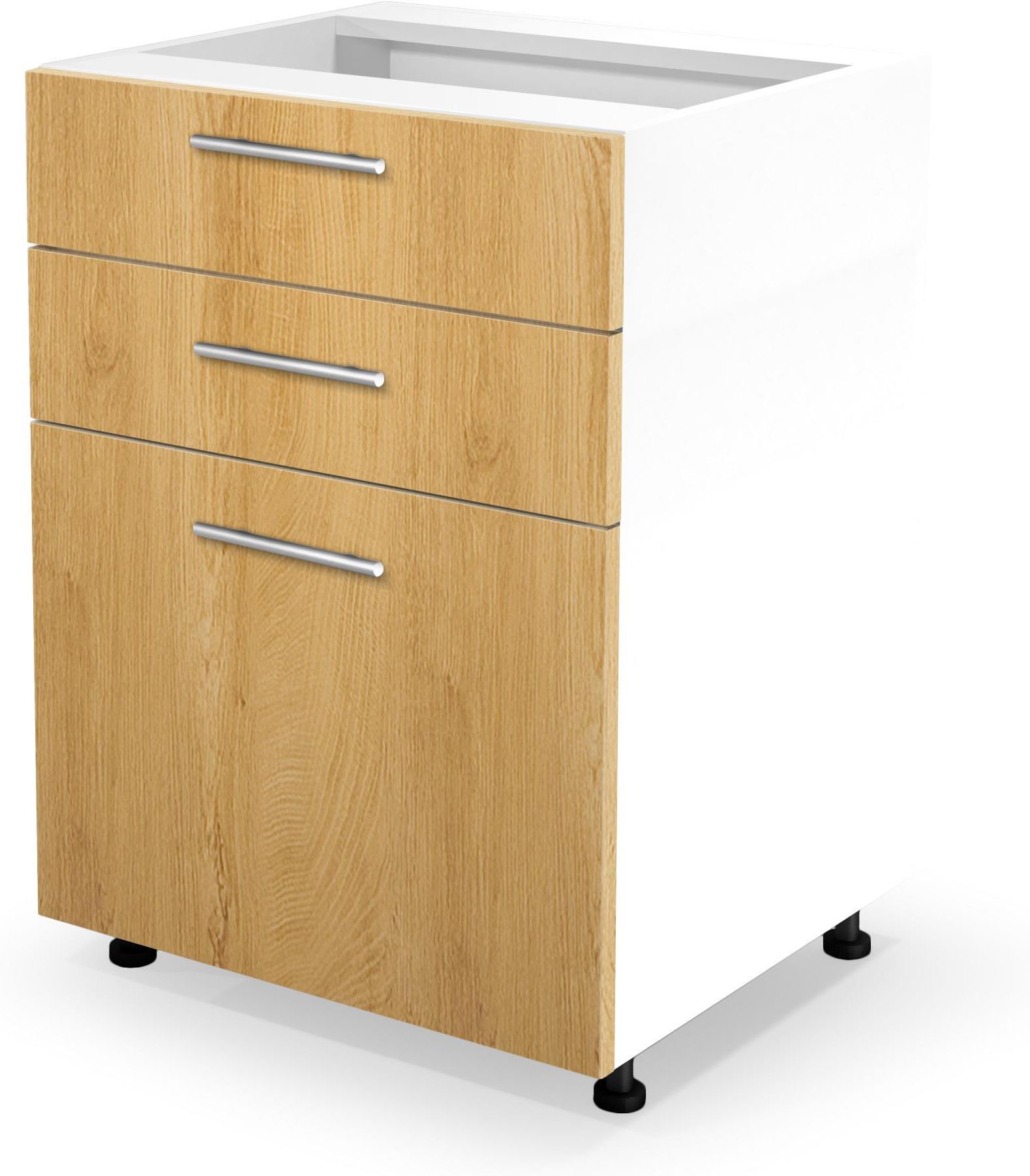 Szafka dolna z szufladami kuchenna stojąca Dąb Miodowy VENTO D3S-40/82 Szafka dolna VENTO D3S-40/82 Vento D3S-40/82 to stojąca szafka kuchenna z szufladami należąca do modułowego systemu mebli Vento. Trzy pojemne szuflady pomieszczą wiele przedmiotów różnej wielkości, po które można wygodnie sięgać. W szufladach zastosowano prowadnice Hettich gwarantujące precyzyjną pracę i wysoką stabilność boczną, dzięki dokładnemu prowadzeniu. Posiadają zintegrowane zabezpieczenie przed samoczynnym i całkowitym wysunięciem szuflady. Szafka z szufladami Vento o szerokości 40 cm świetnie sprawdzi się w nowoczesnej aranżacji kuchni jako praktyczne miejsce służące do wygodnego przechowywania zestawu sztućców, przyborów kuchennych czy suchej żywności. Cechy produktu front – płyta MDF 16 mm / dąb miodowy korpus – płyta laminowana 16 mm / biały mat prowadnice Hettich uchwyt metalowy regulowane nóżki 100 mm samodzielny montaż blat dostępny jako osobny produkt Wymiary Szerokość: 40 cm Wysokość: 82 cm Głębokość: 52 cm Waga: 24.6 kg Wykończenie Front został wykonany z laminowanej płyty wiórowej o grubości 16 mm w pięknym kolorze dębu miodowego z widocznym naturalnym rysunkiem słojów oraz sęków. Korpus wykonano z płyty wiórowej pokrytej laminatem o matowej powierzchni w kolorze białym. Grubość płyty MDF oraz płyty laminowanej wynosi 16 mm. Chromowane uchwyty o długości 128 mm ułatwią wykonywanie codziennych obowiązków. Użyte materiały są łatwe w utrzymaniu czystości oraz odporne na uszkodzenia mechaniczne, co gwarantuje wysoką jakość produktu i jego bezpieczne użytkowanie przez lata. Mebel wyposażono w wytrzymałe regulowane stopki, które pomogą w zachowaniu poziomu wszystkich szafek stojących w razie nierówności podłogi oraz pozwolą na dopasowanie wysokości szafki do wzrostu użytkownika. System VENTO Wybierając meble systemowe Vento – z łatwością stworzysz idealnie dopasowaną do indywidualnych potrzeb kuchnię w nowoczesnym stylu. System oferuje kilkadziesiąt szafek kuchennych – górnych, dolnych, zlewozmywakowych, pod piekarnik itp. dostępnych w różnych rozmiarach i wariantach kolorystycznych, które można razem zestawić i skomponować wymarzony zestaw kuchenny. Dzięki eleganckim meblom modułowym Vento zaprojektujesz ponadczasową kuchnię samodzielnie. Wystarczy, że dokładnie zmierzysz przestrzeń, wybierzesz ulubione szafki, które pasują wymiarami do Twojego projektu i gotowe! Nieograniczone możliwości wyboru elementów sprawiają, że każda kuchnia z pewnością będzie niepowtarzalna. Przykładowe zestawienia Dostępne warianty mebli modułowych VENTO