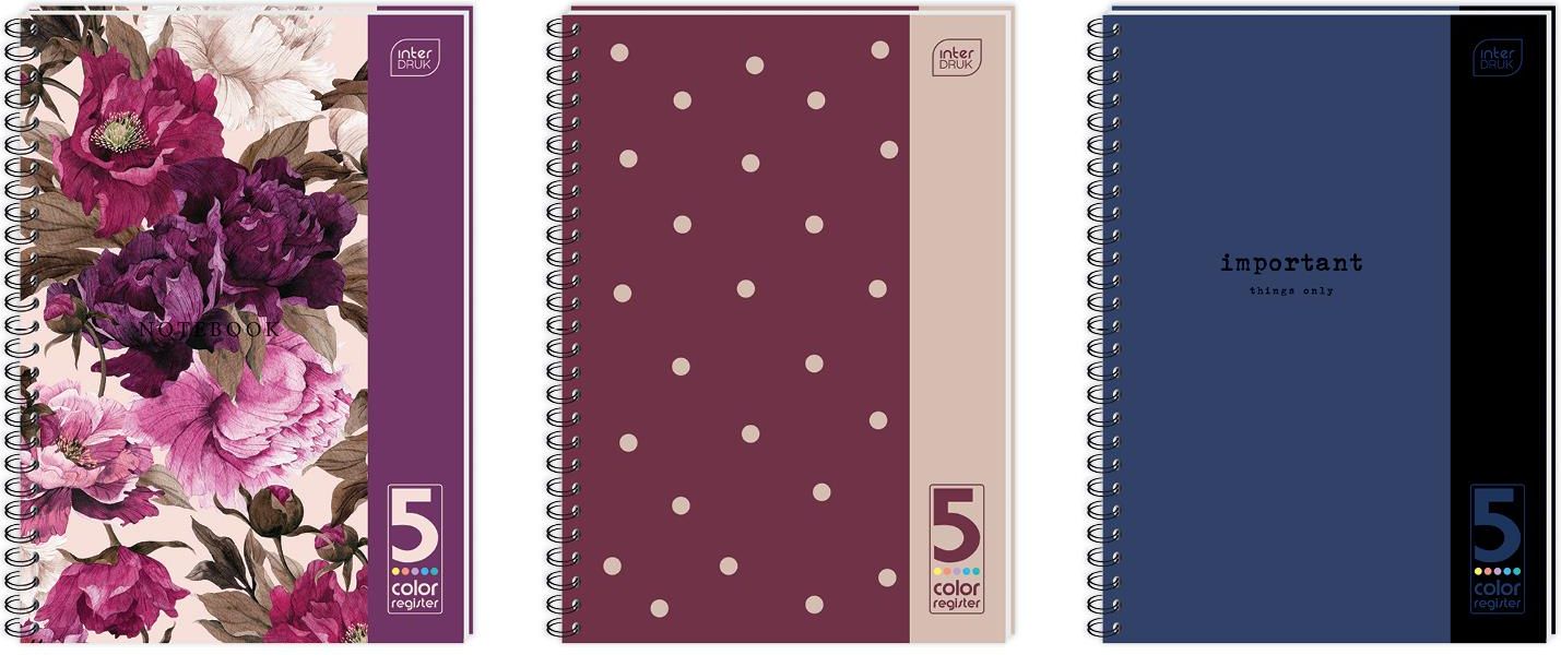 Format: A5. Liczba kartek: 100. Zadruk w kratkę. Ostre rogi. Pojedyncza spirala wkręcana. Otwory do segregatora. Perforacja wzdłuż grzbietu, ułatwiająca wyrywanie kartek. Spirala po długim boku. W środku 5 kolorowych, wycinanych registrów. MIX KOLORÓW! Wysyłamy kolor losowy.