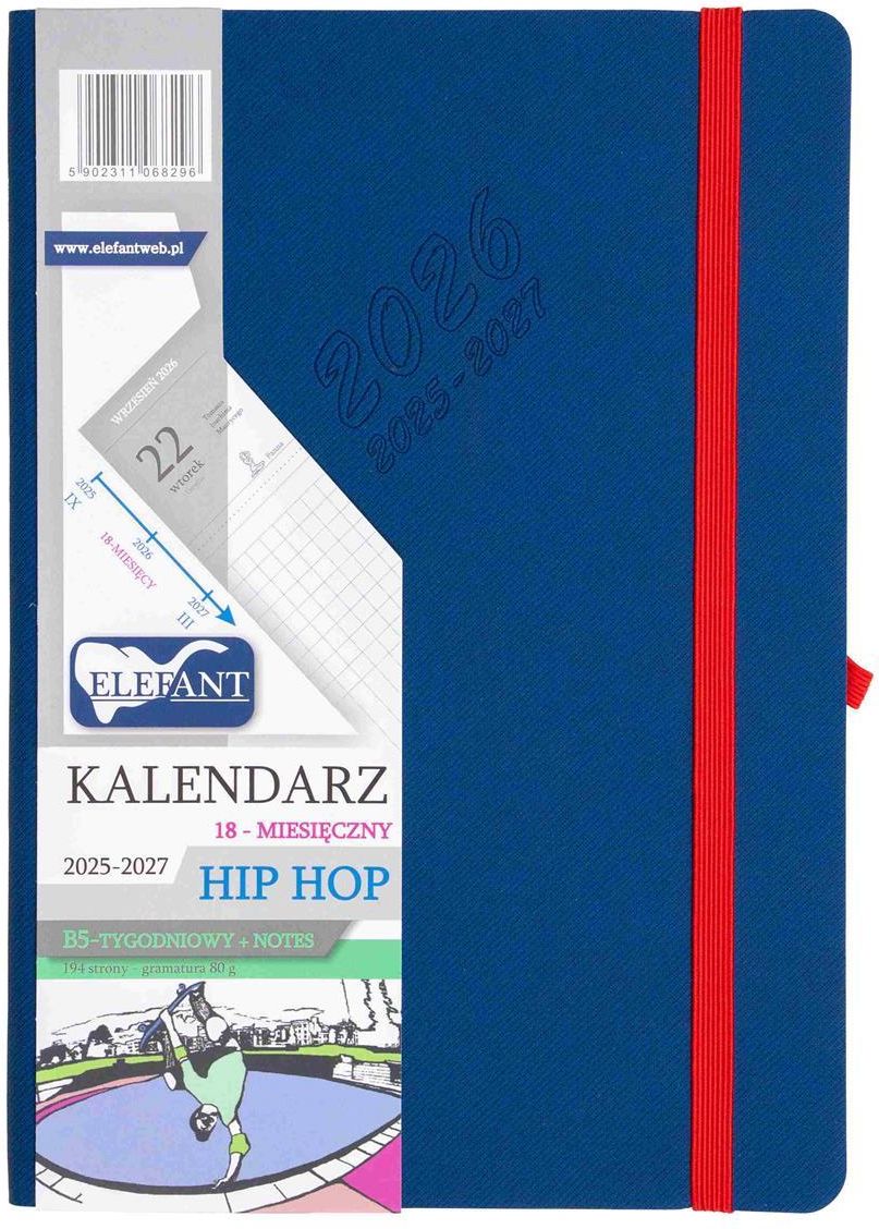 Kalendarz 2026 B5 18 miesięcy Hip hop, granatowy Ten kalendarz wykonano z trwałych materiałów. Tydzień znajduje się na stronie z lewej strony, a z prawej notes w kratkę.Szczegóły:• zamykany na gumkę w kolorze dostosowanym do każdego koloru osobno,• specjalne nity ozdobne do przymocowania gumki w oprawie,• gumka na długopis w kolorze dostosowanym do każdego koloru osobno,• zaokrąglone narożniki opraw i stron, • brzegi kalendarza z kolekcji Hip Hop są w kolorze kremowym lub w kolorze gumki zamykającej,• tasiemka w kolorze gumki zamykającej,• pierwsze strony wewnątrz wraz z kopertą na tylnej oprawie w kolorze oprawy lub kremowym lub w kolorze gumki zamykającej,• czytelny układ kalendarza Hip Hop: tydzień na stronie w układzie z lewej strony kalendarz tydzień na jednej stronie, a z prawej notes w kratkę ,• kalendarium od 15 września 2025 do 28 marca 2027,• wewnątrz: plan roku i rozkład roku 2025, terminy ferii zimowych, święta oficjalne i zwyczajowe, podróże, protokół powypadkowy w przypadku stłuczki, notes, skorowidz teleadresowy, kalendarium dodatkowe na 2024-2025-2026 rok. Ten kalendarz wykonano z trwałych materiałów. Tydzień znajduje się na stronie z lewej strony, a z prawej notes w kratkę.Szczegóły:• zamykany na gumkę w kolorze dostosowanym do każdego koloru osobno,• specjalne nity ozdobne do przymocowania gumki w oprawie,• gumka na długopis w kolorze dostosowanym do każdego koloru osobno,• zaokrąglone narożniki opraw i stron, • brzegi kalendarza z kolekcji Hip Hop są w kolorze kremowym lub w kolorze gumki zamykającej,• tasiemka w kolorze gumki zamykającej,• pierwsze strony wewnątrz wraz z kopertą na tylnej oprawie w kolorze oprawy lub kremowym lub w kolorze gumki zamykającej,• czytelny układ kalendarza Hip Hop: tydzień na stronie w układzie z lewej strony kalendarz tydzień na jednej stronie, a z prawej notes w kratkę ,• kalendarium od 15 września 2025 do 28 marca 2027,• wewnątrz: plan roku i rozkład roku 2025, terminy ferii zimowych, święta oficjalne i zwyczajowe, podróże, protokół powypadkowy w przypadku stłuczki, notes, skorowidz teleadresowy, kalendarium dodatkowe na 2024-2025-2026 rok.