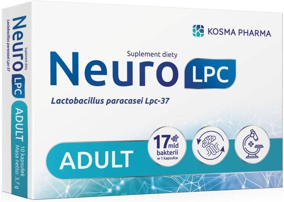 NeuroLPC Adult, 10 kapsułek Suplement diety NeuroLPC Adult to psychobiotyk w postaci kapsułek, przeznaczony dla dorosłych. Zawiera przebadany klinicznie szczep Lactobacillus paracasei (Lpc-37) o wysokiej zawartości 17 miliardów CFU w jednej kapsułce. Szczep Lpc-37 przebadany klinicznie w działaniu poprawy stanu psychicznego i reakcji na fizjologiczne markery stresu i lęku u dorosłych. NeuroLPC Adult - zalecana dzienna porcja Zalecana dzienna porcja do spożycia: dorośli 1 kapsułka dziennie po posiłku, popić letnią wodą lub innym letnim płynie (mleko, sok, jogurt). NeuroLPC Adult - skład Składnik: Lactobacillus paracasei Lpc-37 Zawartość w dziennej porcji (1 kapsułka): 76 mg (17 mld CFU) %RWS*: - *RWS - Referencyjna Wartość Spożycia Składniki: skrobia, otoczka kapsułki: hydroksypropylometyloceluloza, Lactobacillus paracasei (Lpc-37), barwnik: węglan wapnia. NeuroLPC Adult - uwagi do stosowania Nie należy przekraczać zalecanej porcji do spożycia w ciągu dnia. Suplementy diety nie mogą być stosowane jako substytut (zamiennik) zróżnicowanej diety. Suplementy diety nie zastępują zrównoważonego sposobu żywienia i zdrowego trybu życia. Suplement diety należy przechowywać w oryginalnym, zamkniętym opakowaniu w temperaturze 8-25°C. Chronić przed światłem i wilgocią. Suplementy diety powinny być przechowywane w sposób niedostępny dla małych dzieci. Nie podawać małym dzieciom poniżej 3 roku życia. Może zawierać soję i produkty pochodne oraz mleko i produkty pochodne (łącznie z laktozą).