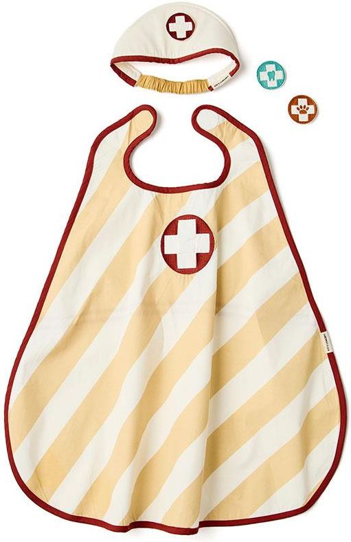 Peleryna Doktora – zabawa w lekarza, dentystę i weterynarza Peleryna Opiekuna to doskonały wybór dla dzieci, które marzą o opiece nad innymi – czy to w roli lekarza, dentysty, czy weterynarza. Dzięki prostemu zapięciu na rzep jest łatwa do założenia i zdjęcia, co sprawia, że doskonale sprawdza się podczas zabawy w przebieranki. Zestaw zawiera również miękko wypełnioną opaskę z trzema wymiennymi odznakami przedstawiającymi symbole weterynarza, dentysty i lekarza. Dzięki rzepom dzieci mogą w łatwy sposób zmieniać odznaki, dopasowując je do aktualnie odgrywanej roli. To idealna zabawa dla małych opiekunów, którzy chcą badać zwierzątka, wykonywać przeglądy zębów czy troszczyć się o pacjentów. Zestaw zawiera 1x peleryna opiekuna 1x opaska z wymiennymi odznakami (weterynarz, dentysta, lekarz) Rekomendowany wiek Odpowiedni dla dzieci od 3. roku życia. Certyfikaty i materiały Materiał tekstylny (peleryna i opaska) – 100% bawełna organiczna Wypełnienie opaski – pianka poliuretanowa (PU) Certyfikat CE Parametry Długość peleryny: 75 cm Szerokość peleryny: 65 cm Grubość: 1 cm Obwód elastycznej opaski: 50 cm Kolor: biały, czerwony Waga zestawu: 130 g Instrukcja czyszczenia / informacje dodatkowe Prać w pralce w temperaturze 30°C. Nie prasować. Nie suszyć w suszarce bębnowej. Informacje o bezpieczeństwie Produkt nieodpowiedni dla dzieci poniżej 3 lat. Ostrzeżenie: długi sznurek – ryzyko uduszenia. Chronić przed ogniem.