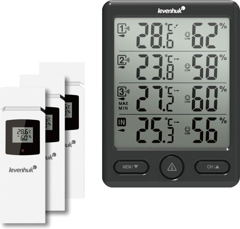 Stacja meteorologiczna Levenhuk Wezzer PLUS LP20 umożliwiająca pomiar temperatury i poziomu wilgotności w czterech miejscach jednocześnie. To bardzo przydatne urządzenie do monitorowania zmian pogody oraz mikroklimatu w kilku lokalizacjach, np. kilku budynkach w posiadłości. Stacja główna mierzy temperaturę i wilgotność w miejscu montażu i można ją zamontować na ścianie lub postawić na płaskiej powierzchni. Trzy zdalne czujniki bezprzewodowe przesyłają dane do stacji głównej za pośrednictwem łączności radiowej. Można je zamontować na ścianach do 100 metrów od stacji głównej. Ekran stacji głównej jest podzielony na cztery sekcje, z których każda wyświetla odczyty w formie graficznej. W każdej sekcji jest widoczny wskaźnik poziomu komfortu: uśmiechnięta buźka informująca o tym, czy w pomieszczeniu panują optymalne warunki pod względem temperatury i wilgotności. Wartości maksymalne i minimalne są rejestrowane, a w razie potrzeby można pobrać historię pomiarów. Wszystkie czujniki mają własne ekrany, umożliwiając tym samym sprawdzanie danych zarówno na czujnikach, jak i stacji bazowej. Kolejną wspaniałą funkcją stacji meteorologicznej Levenhuk Wezzer PLUS LP20 są powiadomienia o pogodzie. Możesz ustawić własne limity temperatury i wilgotności, których przekroczenie spowoduje wygenerowanie sygnału alarmowego. Pomaga to, np. dowiedzieć się w odpowiednim momencie o nadmiernym poziomie wilgoci w domu na wsi i podjąć odpowiednie działania w celu poprawy mikroklimatu. W przypadku czujników zdalnych zaleca się stosowanie baterii alkalicznych. Najważniejsze właściwości: Wielokanałowa stacja meteorologiczna, pomiary w 4 miejscach jednocześnie Historia maksymalnych i minimalnych wartości parametrów meteorologicznych Oceny poziomu komfortu, dobrze widoczne cyfry w poszczególnych sekcjach informacyjnych Zarówno stacja główna, jak i czujniki mają ekrany oraz są zasilane bateriami Programowalne powiadomienia dotyczące niekomfortowych poziomów temperatury i wilgotności Zawartość zestawu: Stacja meteorologiczna Zdalne czujniki - 3 szt. Instrukcja obsługi i karta gwarancyjna Marka Levenhuk, Inc., USA Gwarancja bezterminowa EAN 5905555016405 Rozmiar opakowania (dł. x szer. x gł.) 15x13x5 cm Masa przesyłki 0.37 kg Miejsce użytku wewnątrz, na zewnątrz Typ stacja meteorologiczna Wbudowane funkcje termometr, higrometr Konstrukcja stołowy, mocowana do ściany, cyfrowy, bezprzewodowa Zastosowanie do użytku domowego Jednostki miar % (RH - wilgotność względna) Zakres pomiarowy 20% do 95% Rozdzielczość pomiaru 1% Jednostki miar °C, °F Zakres pomiarowy, wewnątrz -10...+60 °C Zakres pomiarowy, na zewnątrz -40...+70 °C Typ ekranu monochromatyczny Liczba ekranów 4 Częstotliwość sygnału radiowego, MHz 433.92 Promień sygnału radiowego, m 100 Zasilanie stacja meteorologiczna: baterie AA - 2 szt. (sprzedawane osobno), czujniki: baterie AAA - 2 szt. (dla każdego czujnika, sprzedawane osobno) Korpus tworzywo sztuczne Liczba podłączonych czujników zewnętrznych 3 szt. (w zestawie) Szacowanie ogólnego poziomu komfortu yes Czujnik bezprzewodowy yes Rozdzielczość pomiaru 0.1 °C